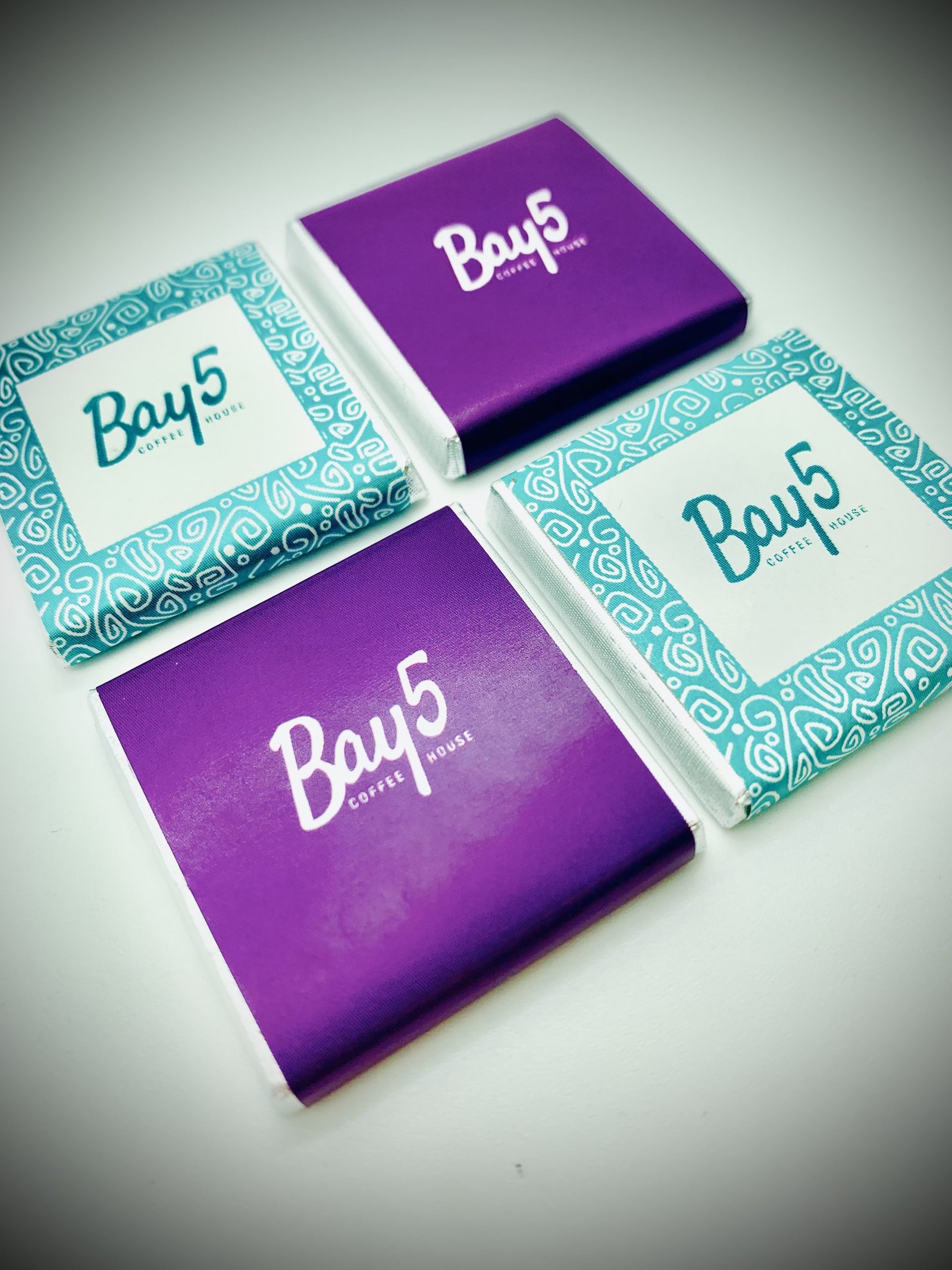 Our friends over at Bay 5 Coffee in Wales requested some colourful branded chocolates to accompany their delicious hot chocolates, coffees, pastries and afternoon tea boxes.