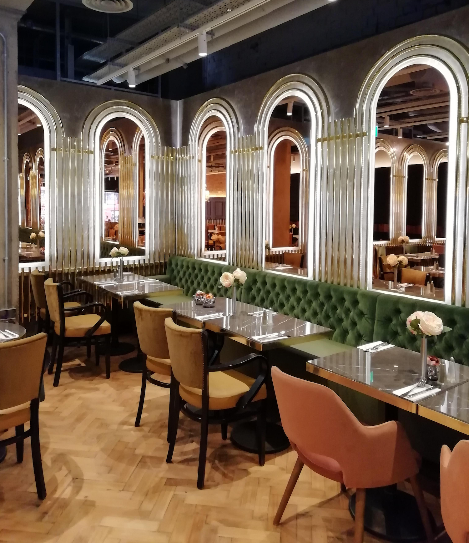 Opposite the Wolseley and a few steps from the Ritz, behind the formal shopfront the interior is quite a surprise, combining the look of a stripped-back warehouse with a sophisticated glamour! The raw concrete and brick shell with its exposed ductwork, conduits and cable trays, contrasts brilliantly with the fine materials making up the fit-out. The bar was replaced by an impressive new counter in Carrara marble overlaid with brass detailing and overhead gantry. Behind this the brick wall features three internally illuminated cabinets displaying wines and spirits above the custom stainless steel back counter. The design theme of simple tubular brass-work is repeated in the screens and balustrades that define the staircases and split-level plan. On one side the wall is lined up to cornice level in timber panelling finished in a soft black – above this the concealed lighting shows off the rough texture of brickwork. The rest of the walls are finished in stucco, a muted antique gold plaster polished on site by the Italian craftsmen, overlaid with an arcade of mirrors with back lighting and framed in tubular brass. In the seating areas an original pine floor in herring-bone parquet was restored, while the entrance pathway is tiled in a three-tone grey octagon and dot motiif. Two enormous chandeliers dominate the lower seating area, while the upper level at the rear has a moody feel with concealed uplighting accented by spotlights. Chairs and banquettes in subdued green, gold and salmon-pink velours sit against brass tables topped with Carrara and Nero Marquina marbles. Replanned, with kitchen moved to the basement, and new toilet suite built on the upper ground floor, the layout added much-needed covers to this busy venue. The front seating area near the bustle of the street has a casual all-day vibe, while the seating on the upper level offers a quieter cosier option. Dover Design is a commercial London design studio specialising in creating effective design and a strong interior brand experience for restaurants, bars and cafes both nationally and internationally.