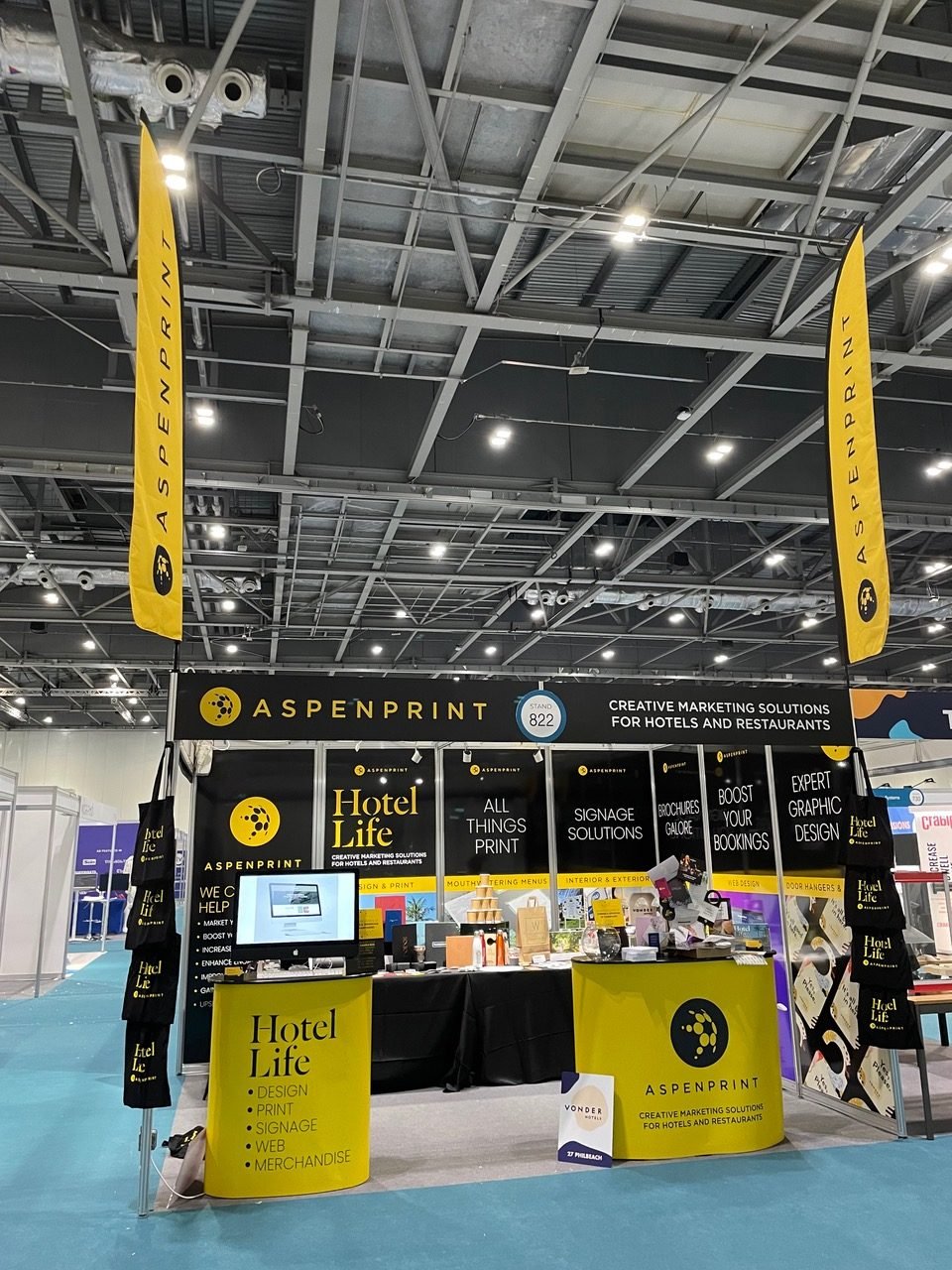 From pop-up stands to shell scheme panels, branded counters, feather flags, signage, posters, giant deckchairs and beyond!