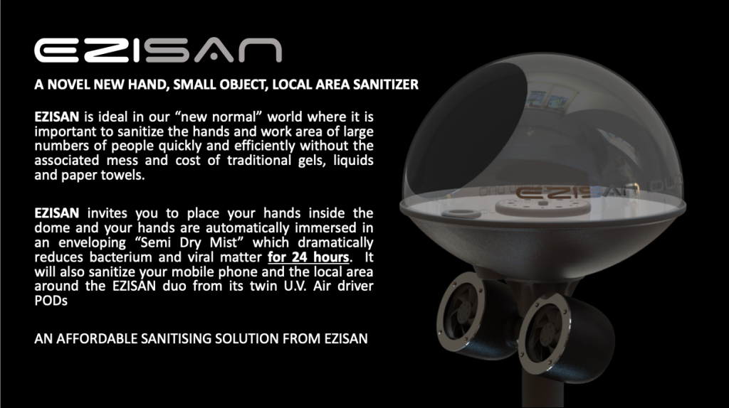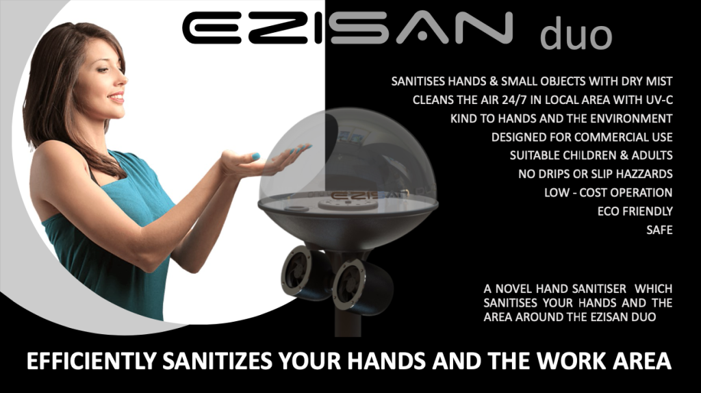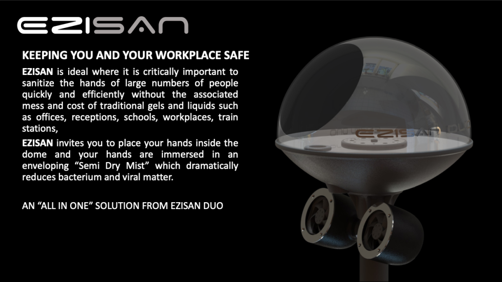 NO TOUCH Simply place your hands or small objects over the sensor and the beneficial sanitizing mist is automatically emitted. The mist is an approved sanitizer and available from Ezisan or its distributors. The product is designed with the latest electronic technology and very easy to service and is delivered with a 12 month warranty.