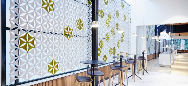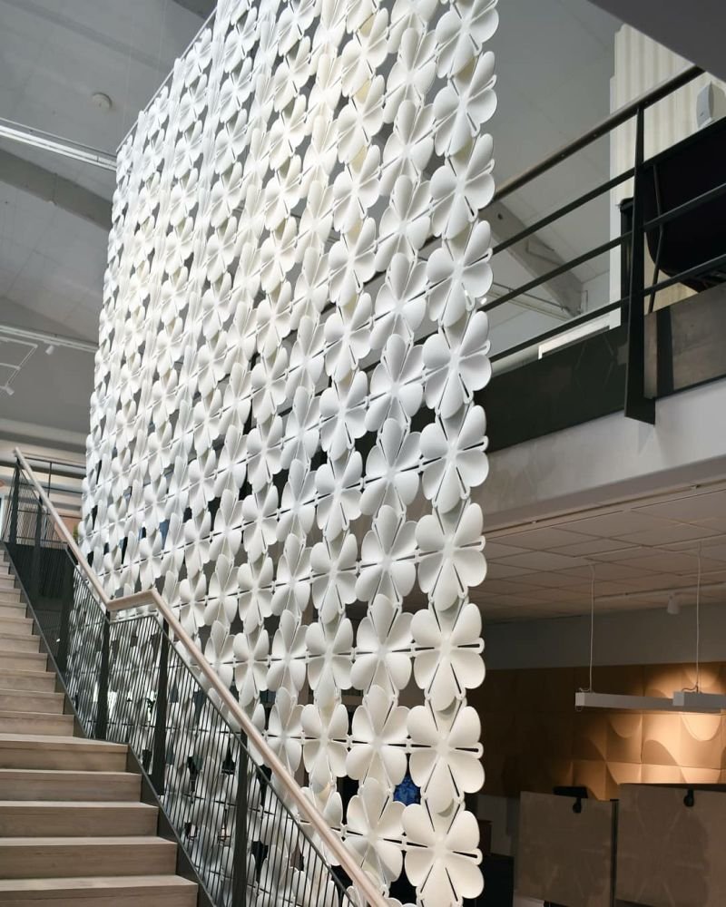 The moulded fibre felt pieces are assembled with plastic connectors and suspended from the ceiling or mounted on the wall using our suspension rail accessory.