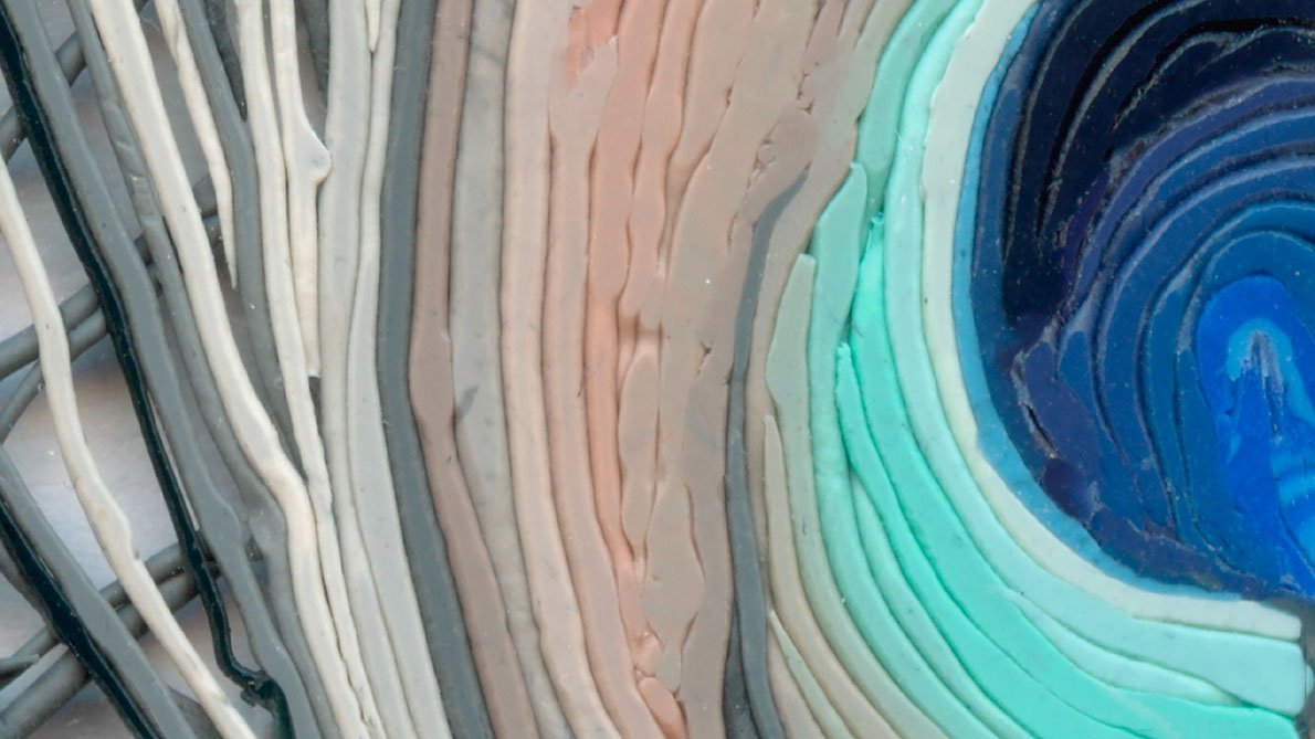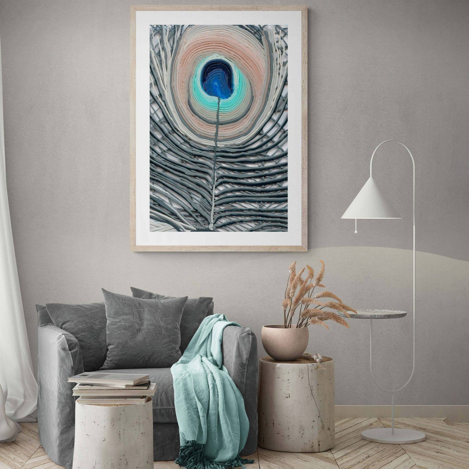This print from the Silver Peacock collection is a close-up of a plume from the Silver Peacock, painted in plasticine on transparent acrylic.