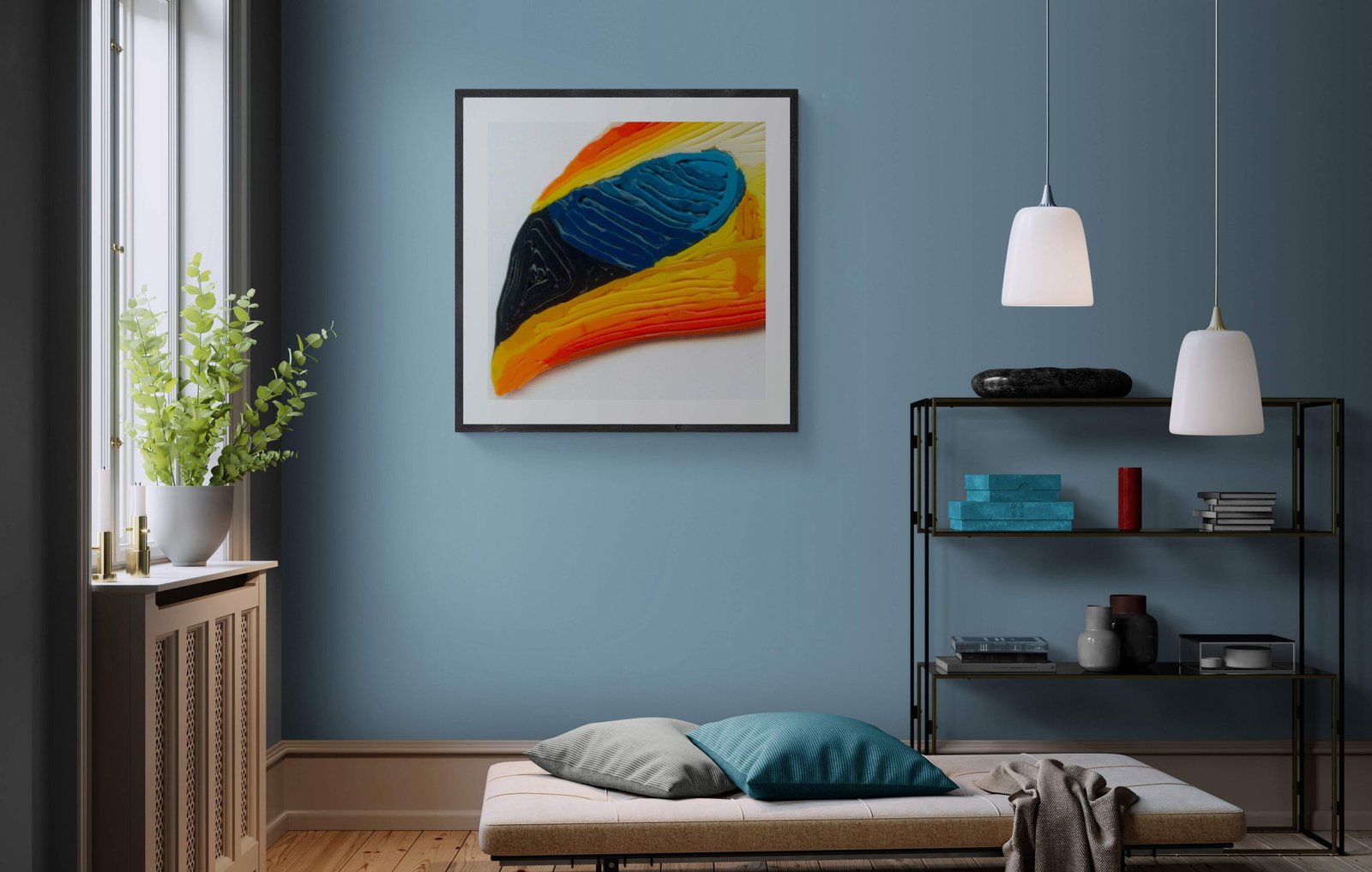 Print of a fragment of Toco Toucan painted with plasticine on transparent acrylic. This closeup shows the beauty and intense colours of plasticine.