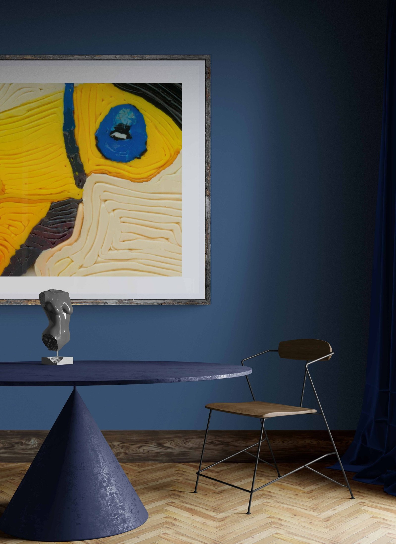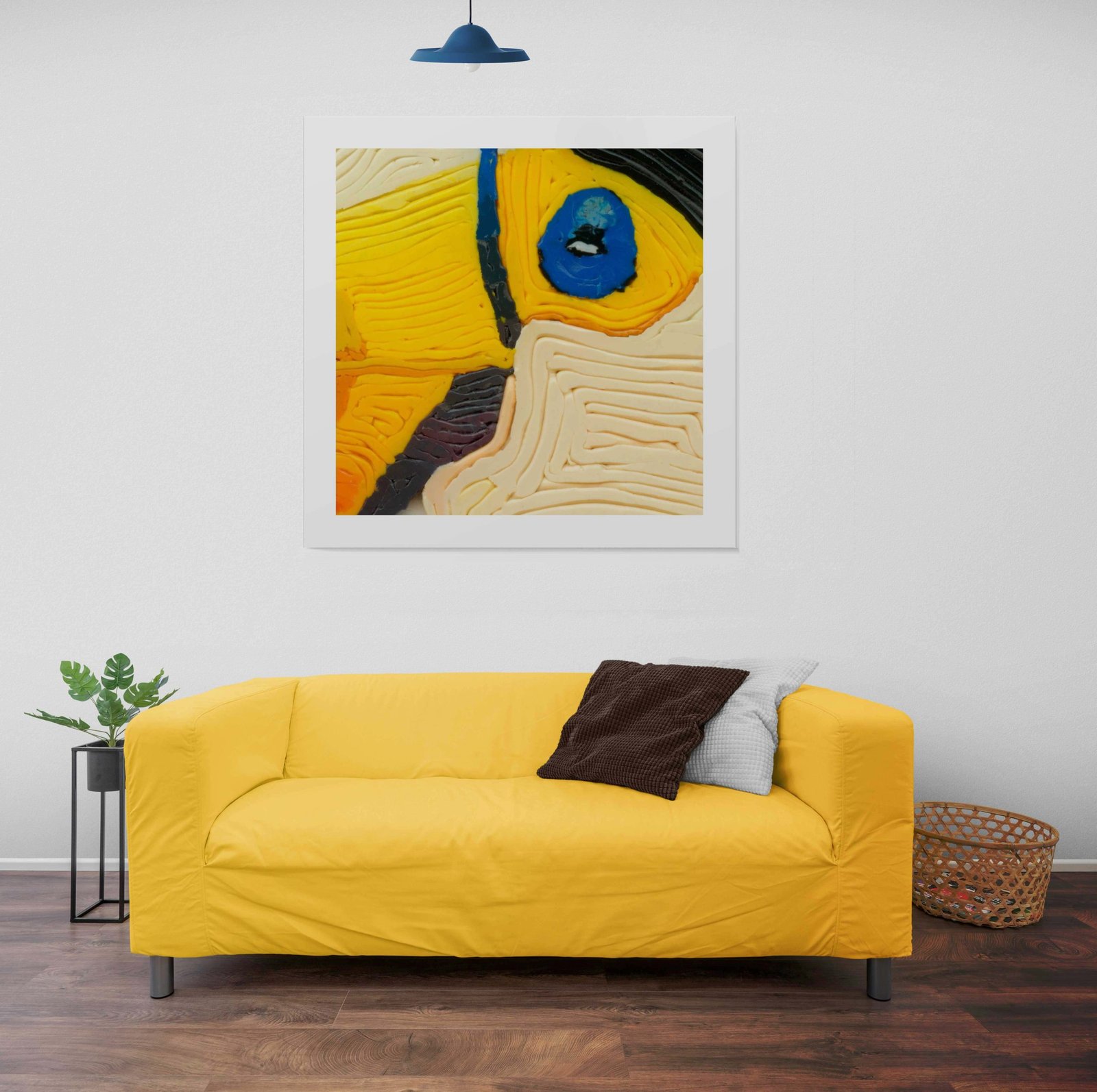 Print of a Toco Toucan eye painted with plasticine on transparent acrylic. This closeup shows the beauty and intense colours of plasticine.