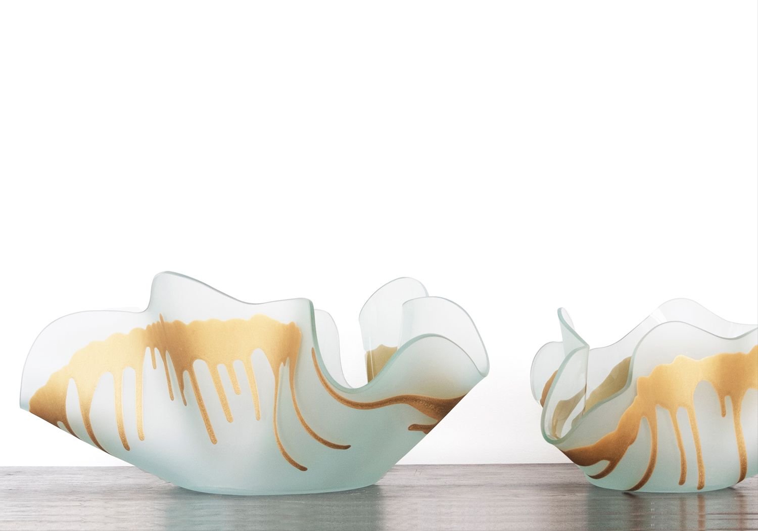 Anemone Sculptures come in two sizes as well as two sizes of votives. Annieglass is forever experimenting with the dynamic movement and texture of glass. These versatile pieces are beautiful holding candles or flowers.