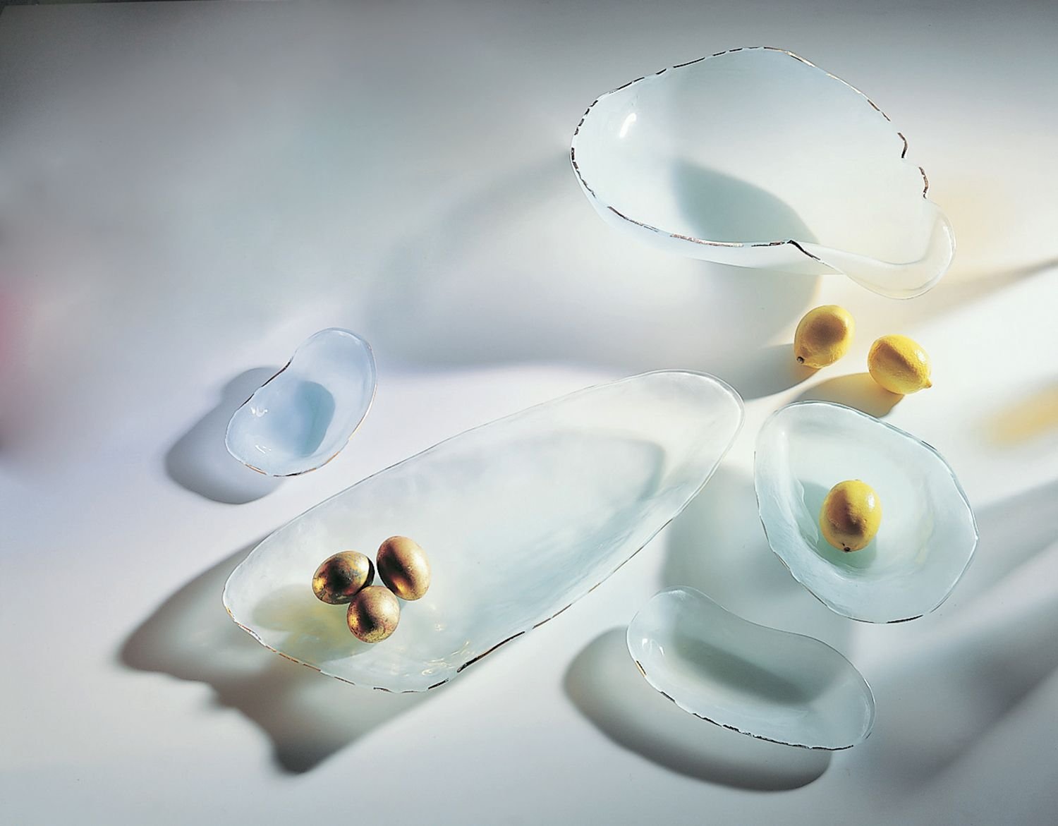 In 2006 the Smithsonian American Art Museum acquired Shells Coquina and Tiburon pieces for their permanent collection. The Shells collection's organic, sculptural shapes of frosted glass are trimmed with glimmering precious gold edges. Available in both frosted and ultramarine.