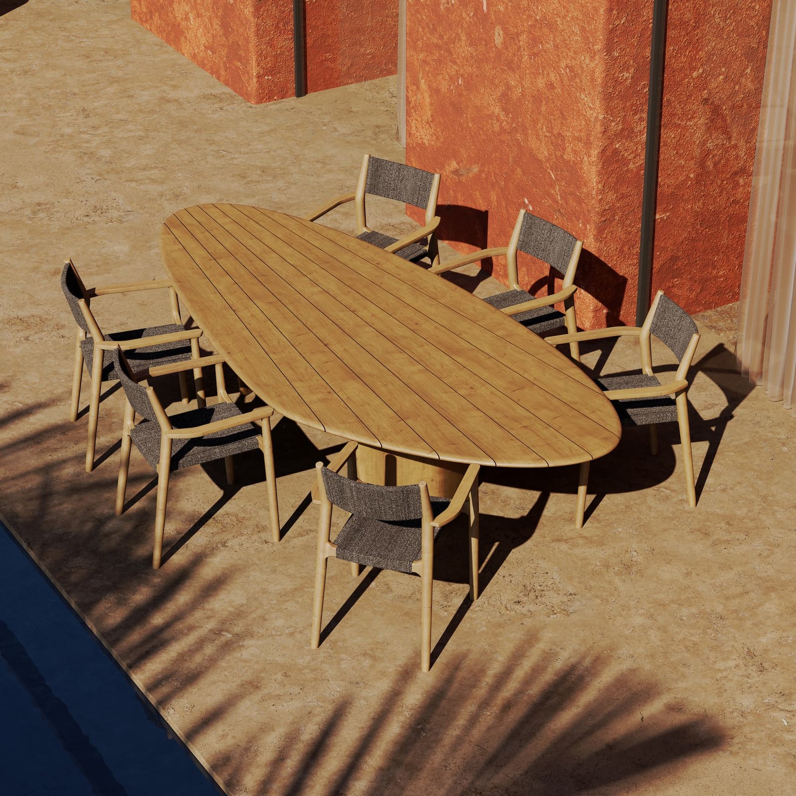 The Maddalena seating collection combines timeless elegance with practical functionality. Available in teak and rope in the color walnut, this collection offers both style and durability for any outdoor space. The Maddalena arm chair (59 x 59 x 83 cm) features a seamless transition from the front legs to the armrests, adding a Scandinavian touch to its design. Stackable for convenience, it blends classic aesthetics with modern practicality, making it perfect for both dining and lounging. The Maddalena bar stool (59 x 50 x 98 cm) showcases smooth lines and a sophisticated silhouette, with a seating height of 60 cm. Designed for comfort and durability, it is the ideal addition to outdoor bars or high tables, elevating any setting with its refined charm.