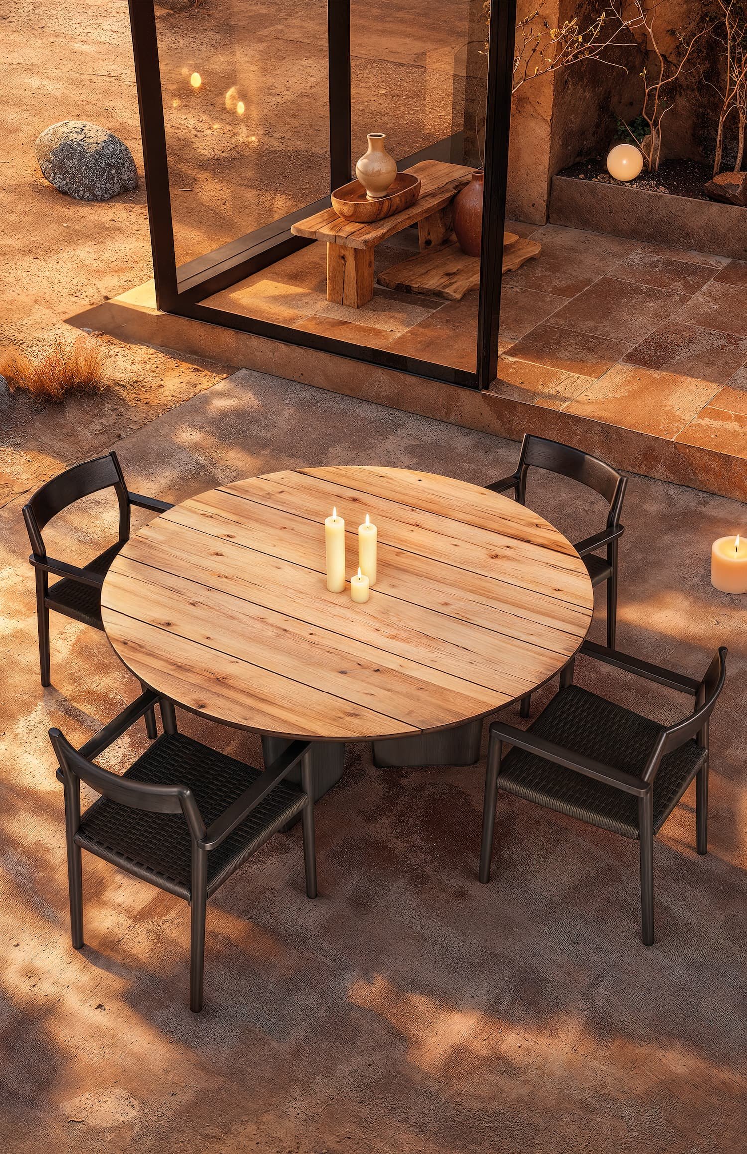 Messina’s tables, crafted from natural and black teak, showcase a beautiful interplay of colors and organic shapes. This collection offers a natural look that enhances the aesthetic appeal of outdoor spaces. Messina’s thoughtful design ensures that each piece integrates seamlessly into its surroundings.
