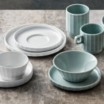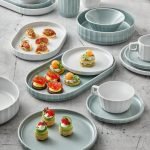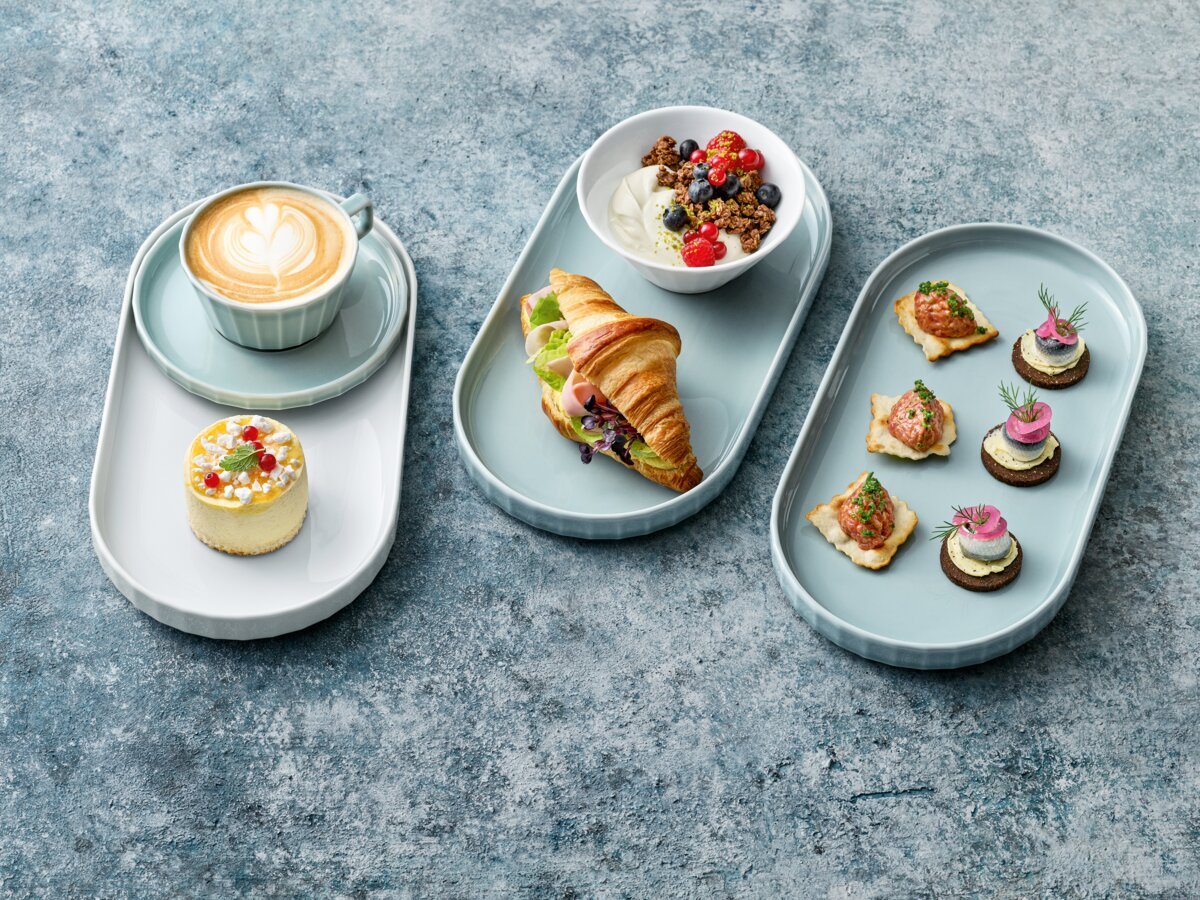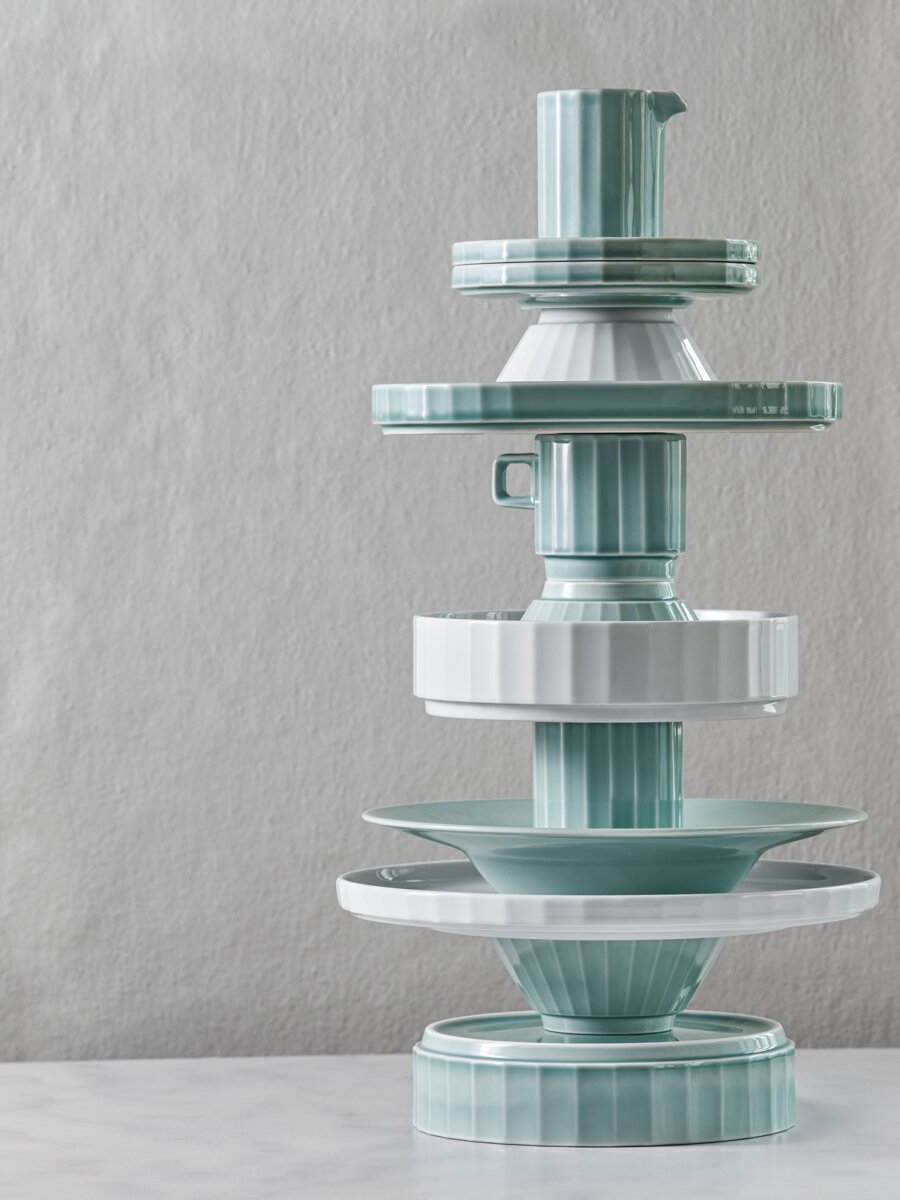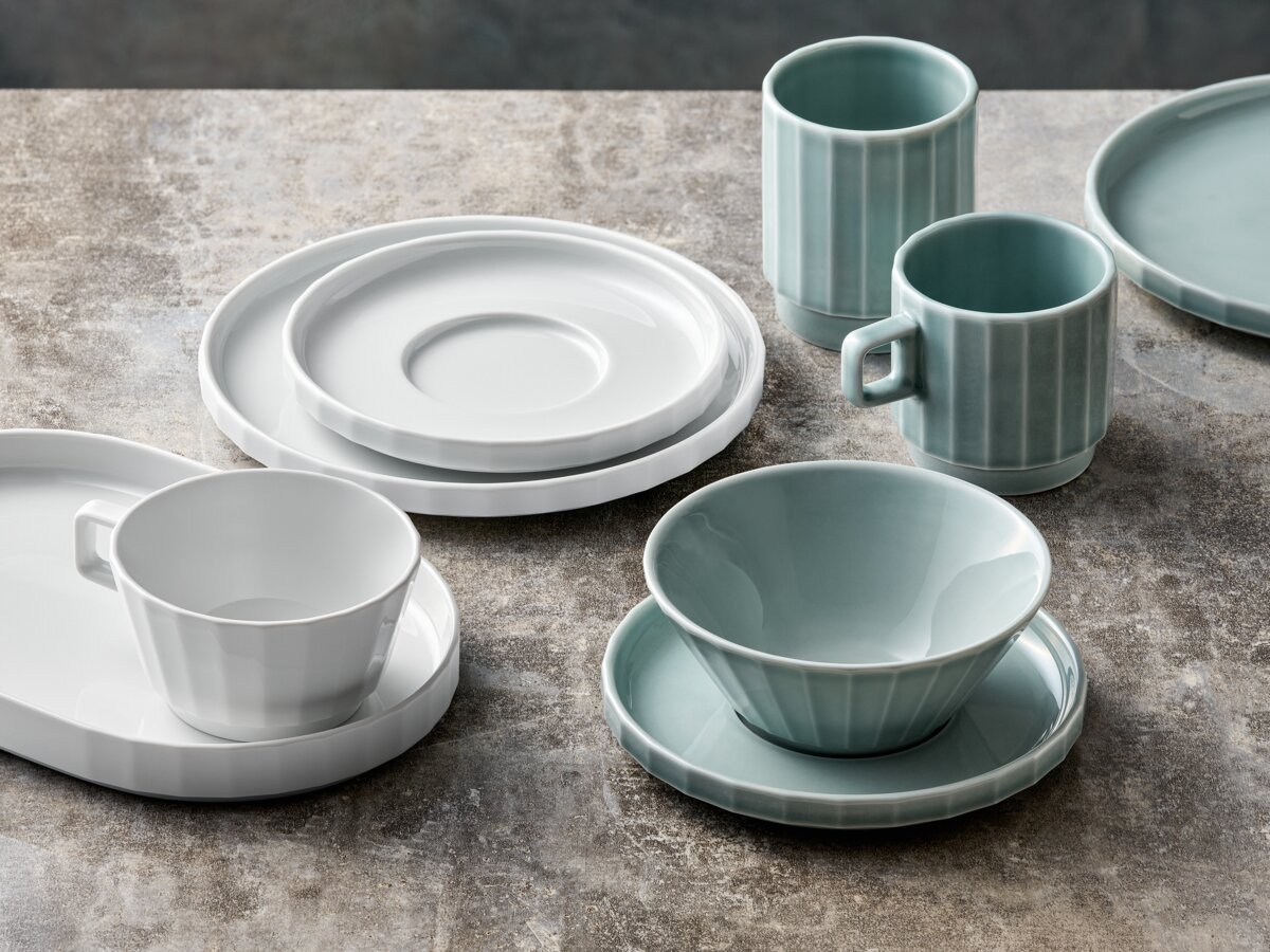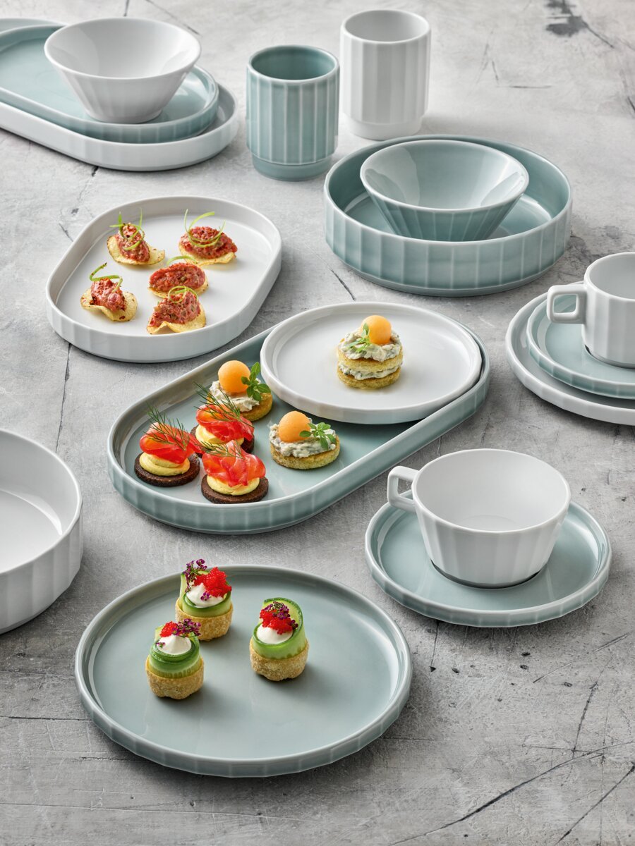 plates, which can also be used as lids for the 15 and 20 cm bowls in the corresponding sizes, deep plates, platters and stackable cups and saucers. Conical cups, ideal for cappuccino. All items are available in versatile white as well as in the fresh SEA colour glaze