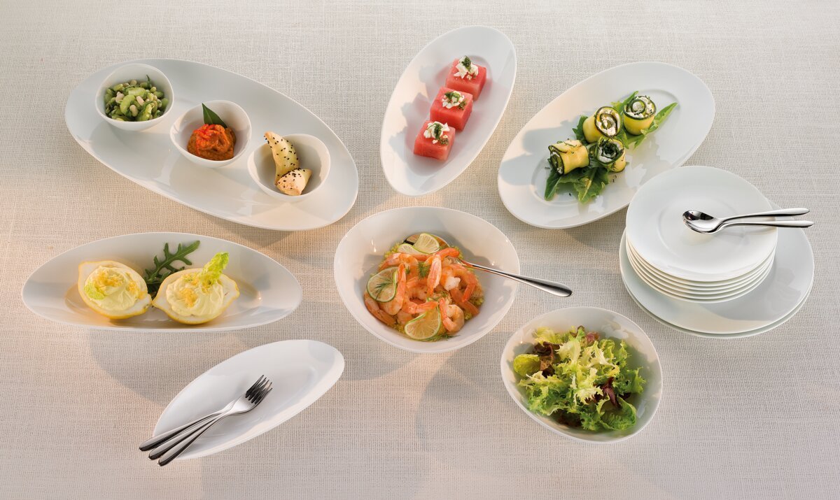 Fine Dining and the elegant GRACE collection are perfect partners. The restrained grace of the round plates is characterized by a soft alternation of concise and disappearing lines. Thus, the dining surface is as freely playable as a coupe plate, but still defined by a partially implied rim. Bowls in the shape of a calla blossom are visual highlights for special meals, also in trend and experience gastronomy.