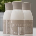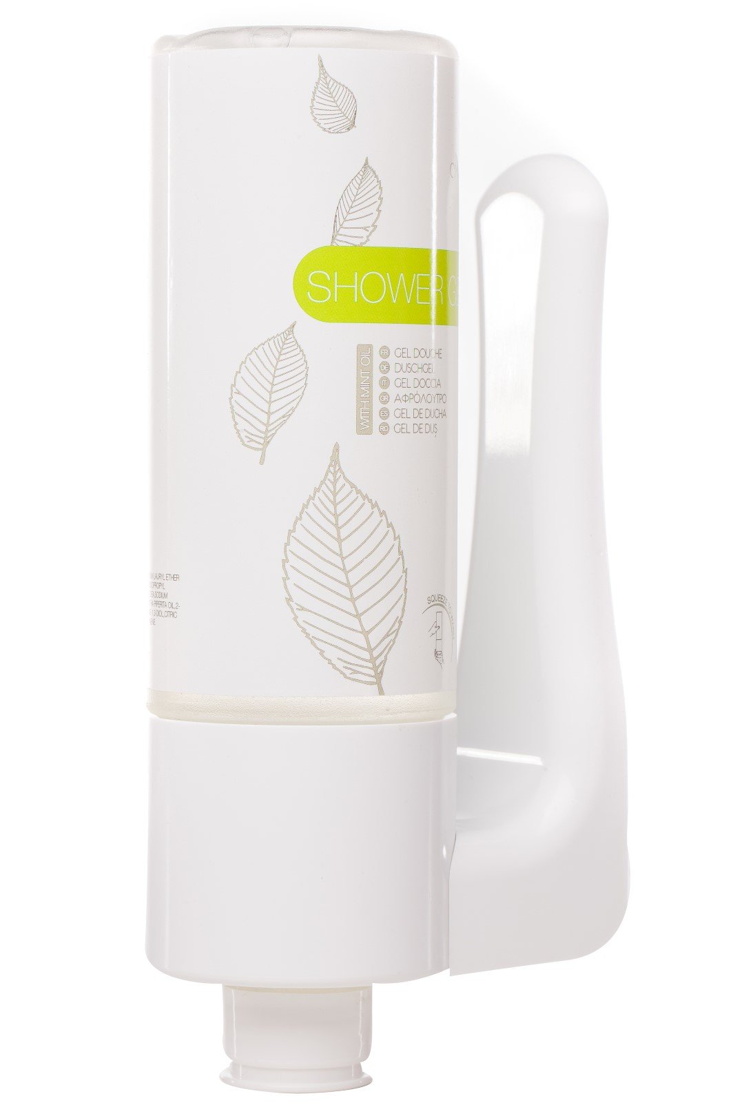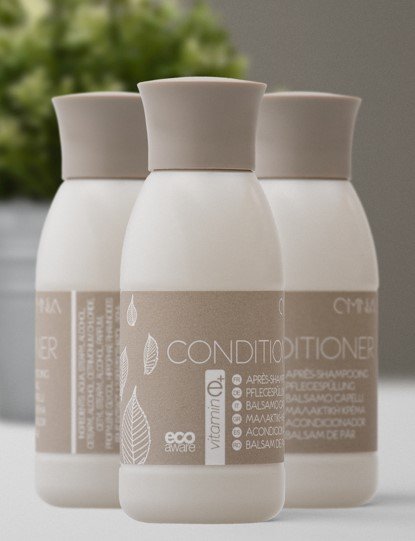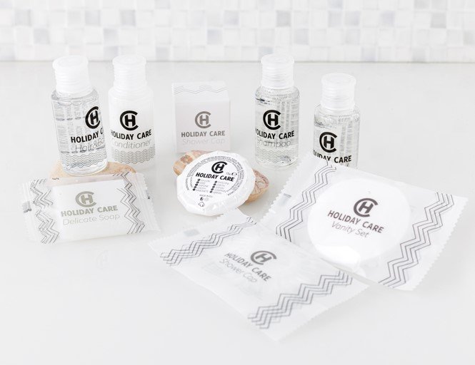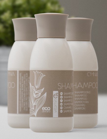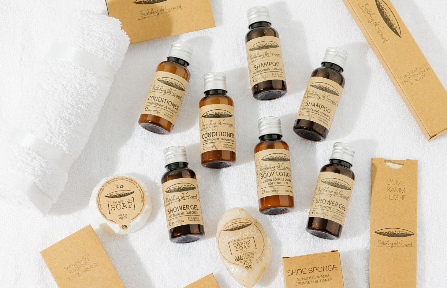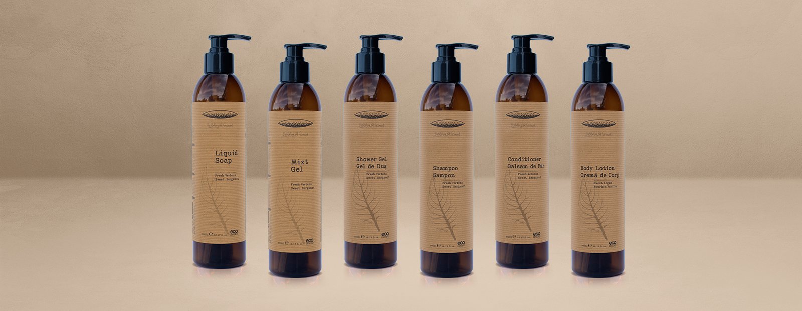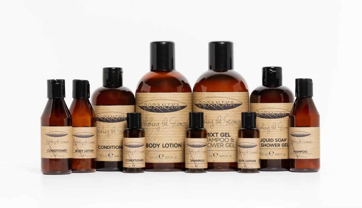 Products available: solid soaps, 35 ml tubes, 30 ml bottles and 450 ml dispensers of shower gel, shampoo, mixt gel, conditioner, body lotion.