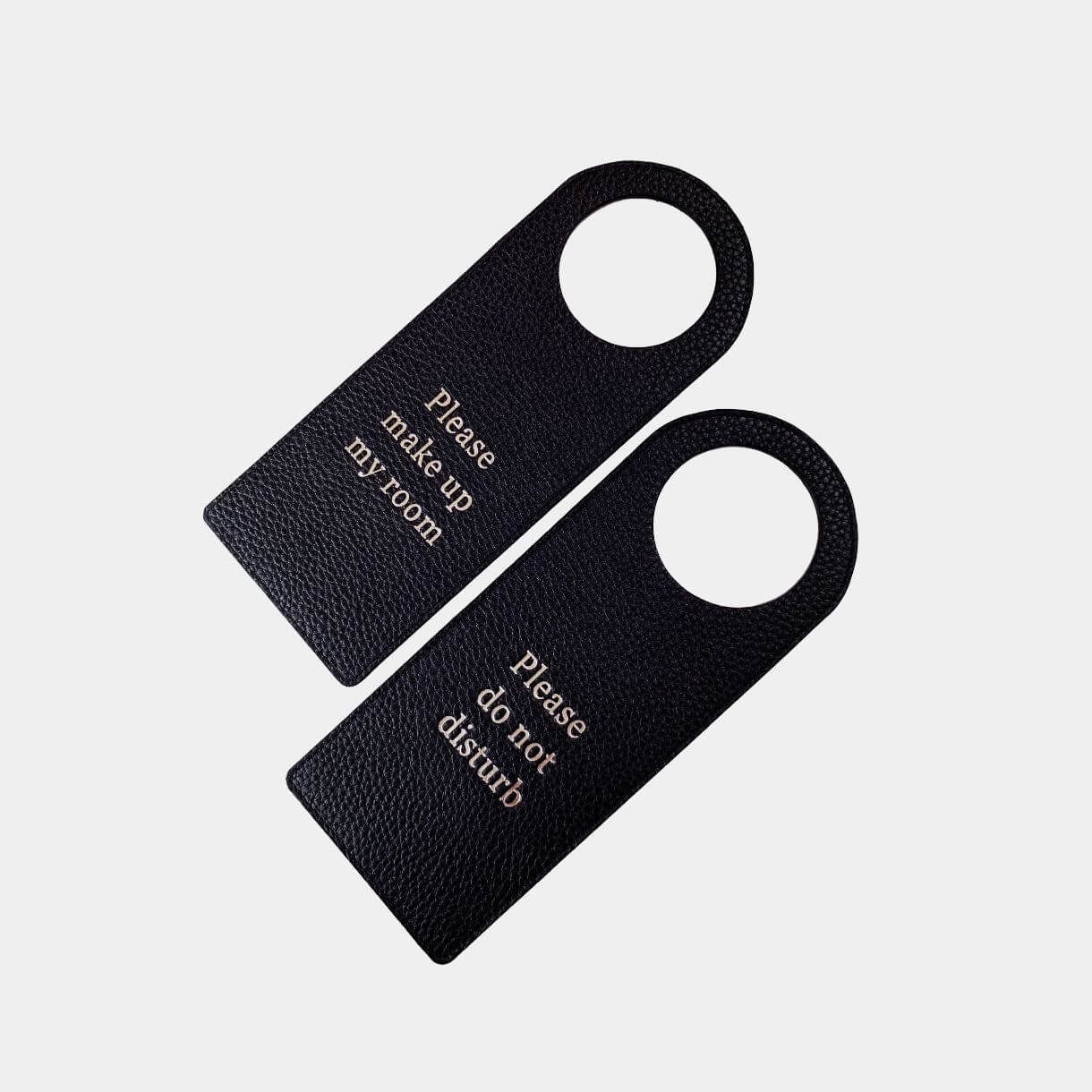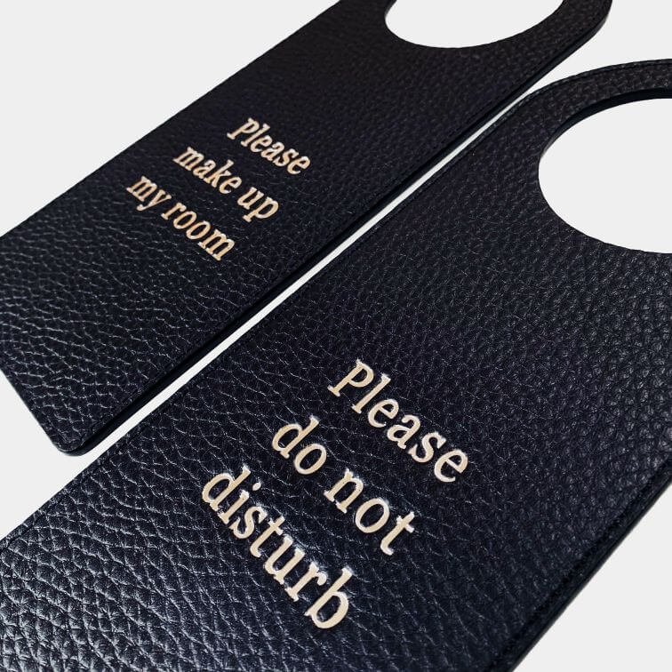 Do not disturb signs, an elevated way for your guests to notify housekeeping to not enter for the time being. These luxury leather hanging door signs can be embossed with any saying that you wish, each order is bespoke allowing us to cater to your every design need.