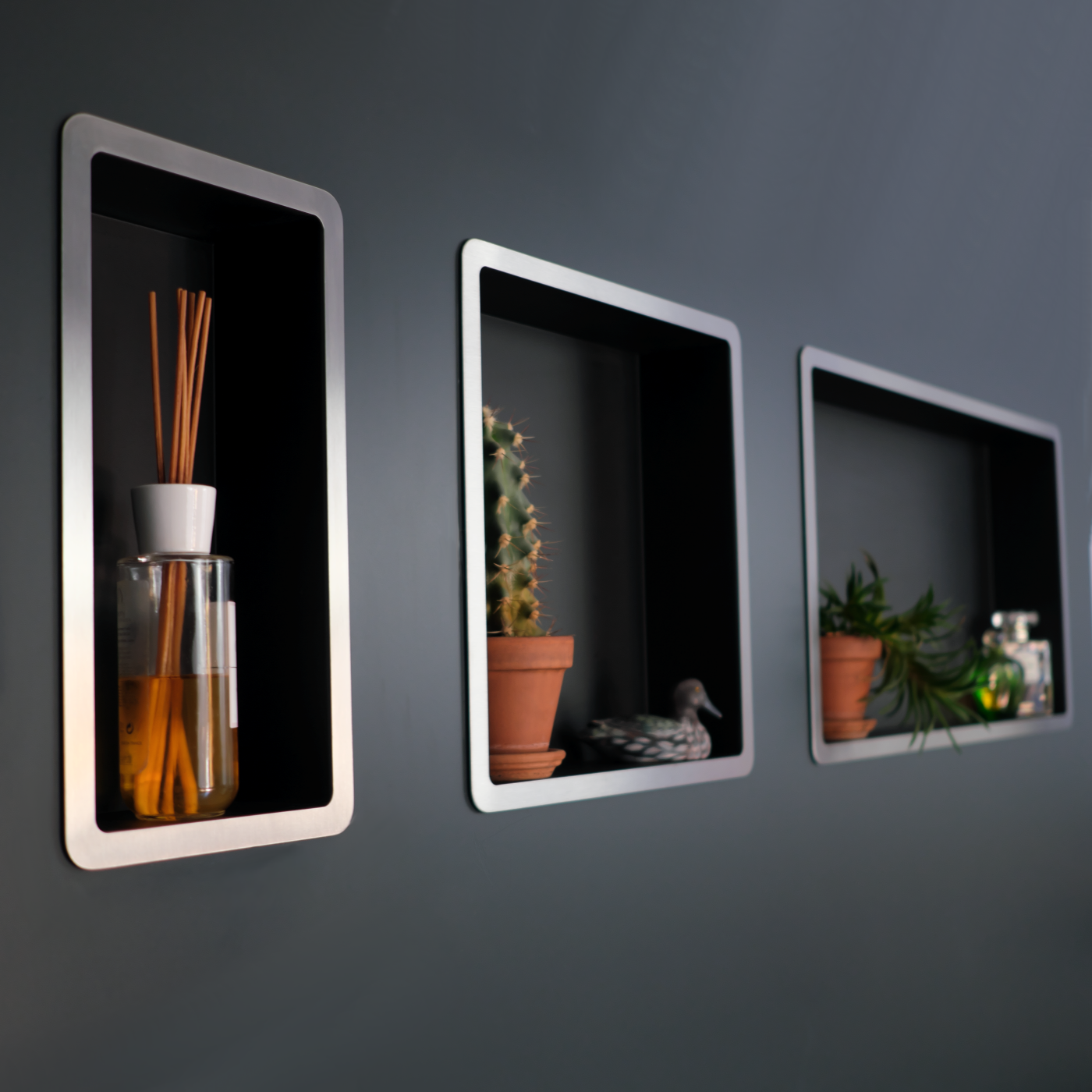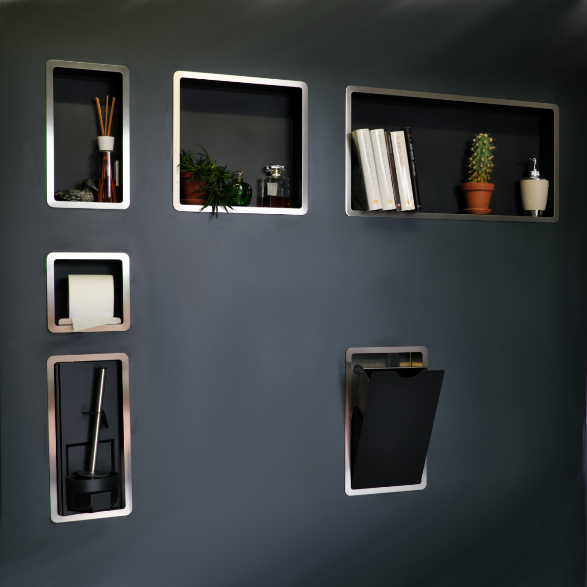 Our built-in niches are available in the following sizes: 15x30x8 cm, 30x30x8 cm, 60x30x8 cm, 15x50x8 cm (with 2 compartments) 15x50x8 cm (with 3 compartments)
