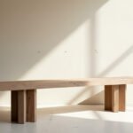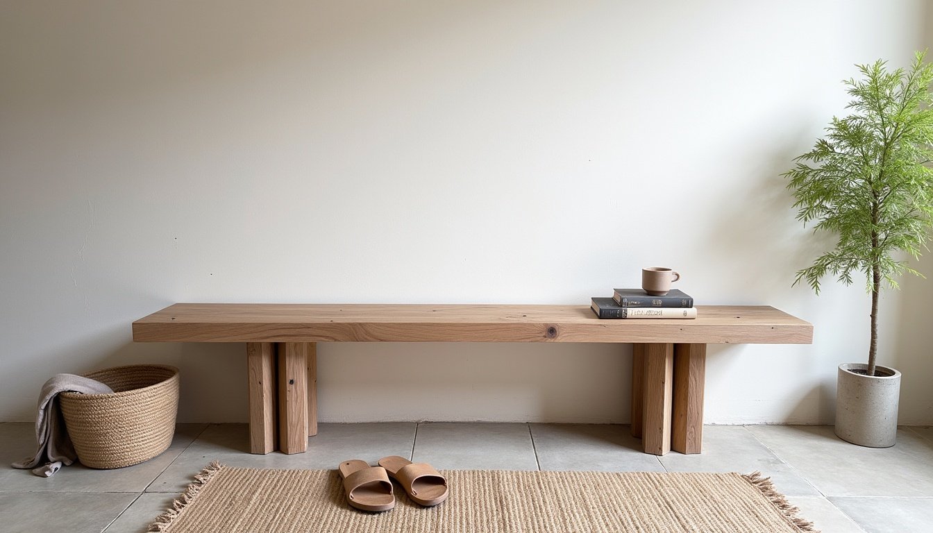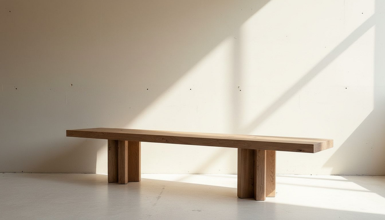 Reclaimed oak bench with a minimal silhouette. Crisp-edged seat and X-shaped legs. A raw, graphic, and warm piece