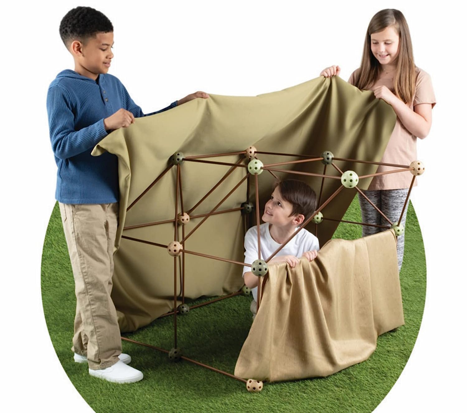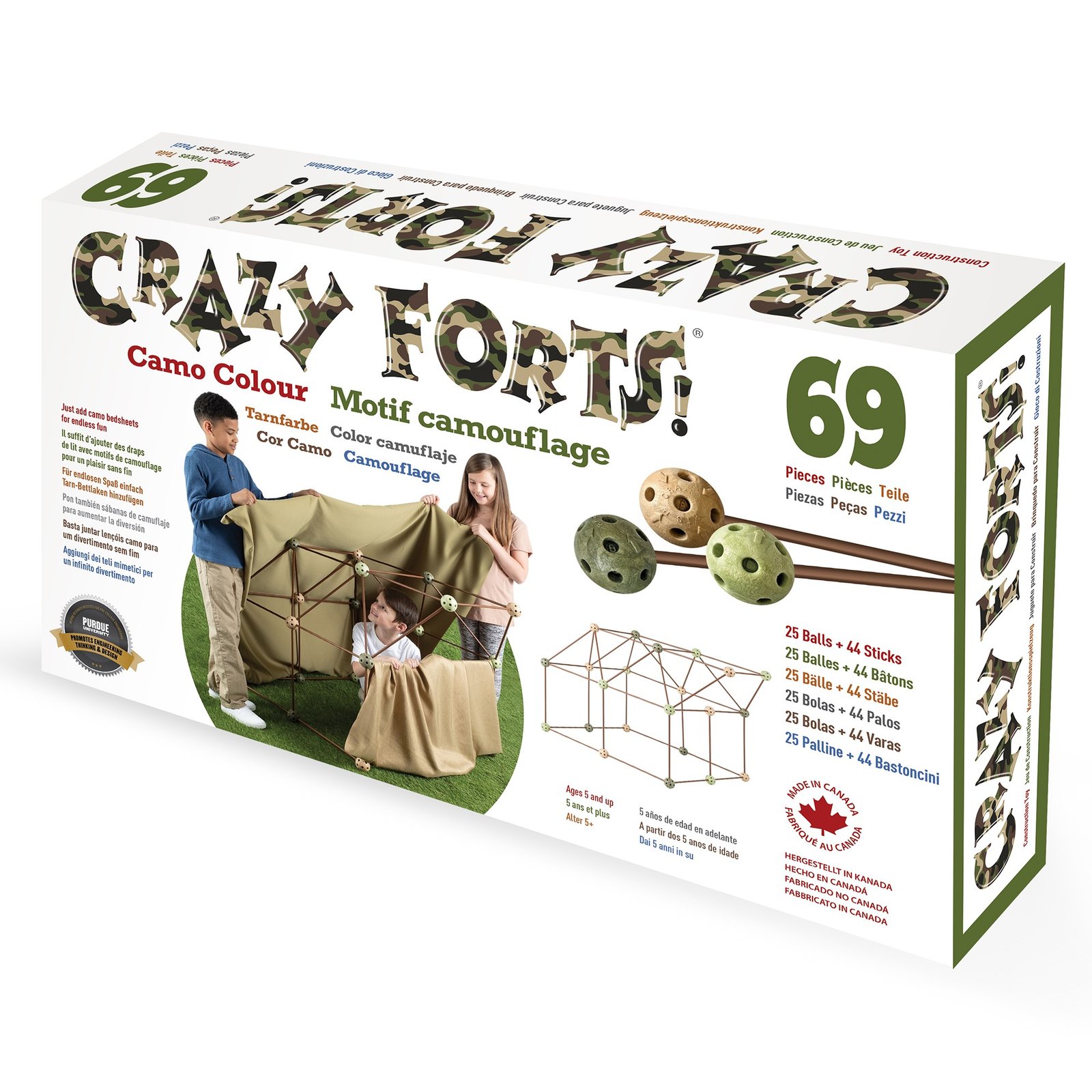 It goes wherever your imagination takes you. Durable. Portable. Easy to Build. A single Award-winning Crazy Fort Kit contains 25 geometrically precise balls and 44 sticks that connect to create a multitude of possible play structures. Simply throw a bed sheet over top and watch their creativity flourish. Children love building fun structures where they can play endlessly in their imaginary world. Crazy Forts makes play so easy and so much fun. With so many ideas, Crazy Forts helps to develop important STEM skills in children, visual planning, logical thinking and creative problem solving to name but a few, that will encourage collaborative play and cooperation in children as well as promoting imaginative play and creativity. A rocket today, an undiscovered cave tomorrow, a princess castle one day and a wild horse in a corral next week are all possible with Crazy Forts.  Simply connect the balls and sticks and cover the structure with bedsheets to create places where imaginations flourish. Crazy Forts allow children to bring a structure from their imagination to life as they work together to construct it. The simple nature of this building set means the possibilities are endless and children enjoyed using their creativity to build a castle, spaceship and even an umbrella! They could then use this as part of the storytelling in their imaginative role-play.  AVAILABLE IN | Original | Glow in the Dark | Multi Coloured | Camouflage | Mega Kit | Master Builder|