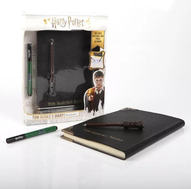 From the Wizarding World comes, Tom Riddle’s Diary Notebook, Slytherin House Pen, & UV Wand. The Slytherin House pen included is filled with invisible ink which can only be seen under the glowing wands UV light. This ensures its magical properties are true to the movie. All you have to do is hover the tip over the pages and what you have written will be magically revealed! Beautiful leather bound effect (not actual leather) with aged metal protective corners.