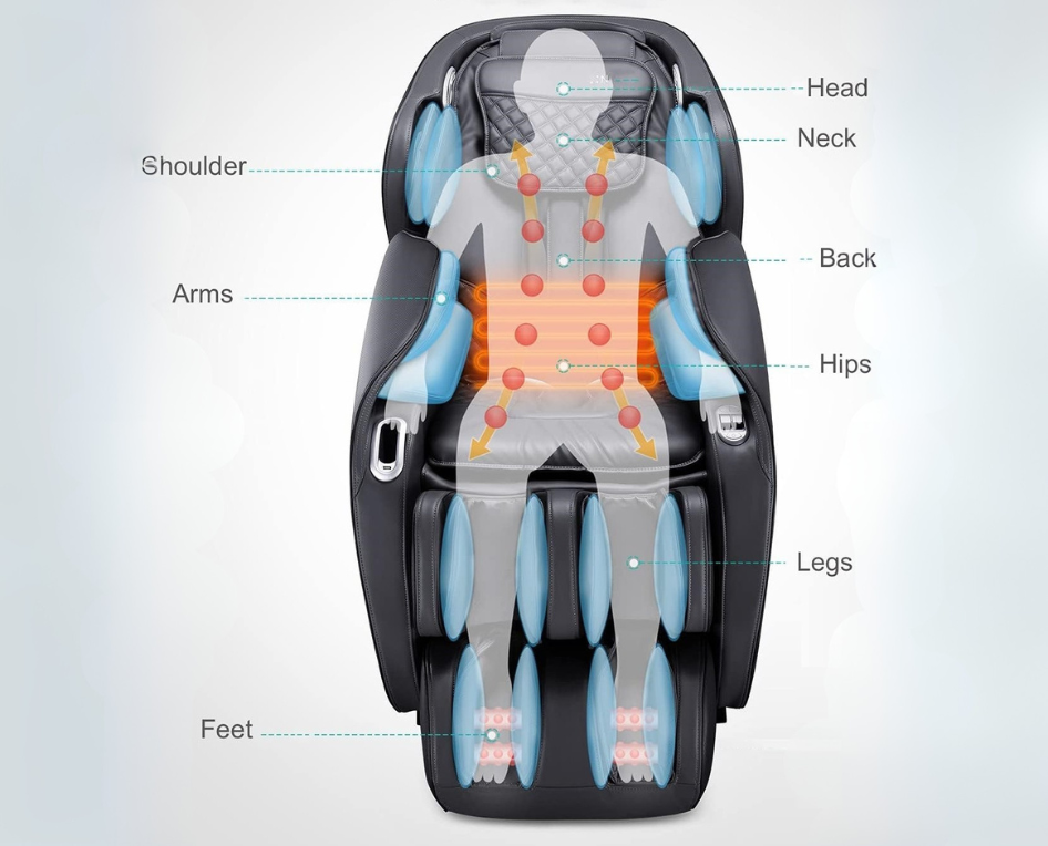 - 52 Compression Airbags strategically placed around the shoulders, arms, hips, calves, and feet to enhance blood circulation and muscle stimulation.