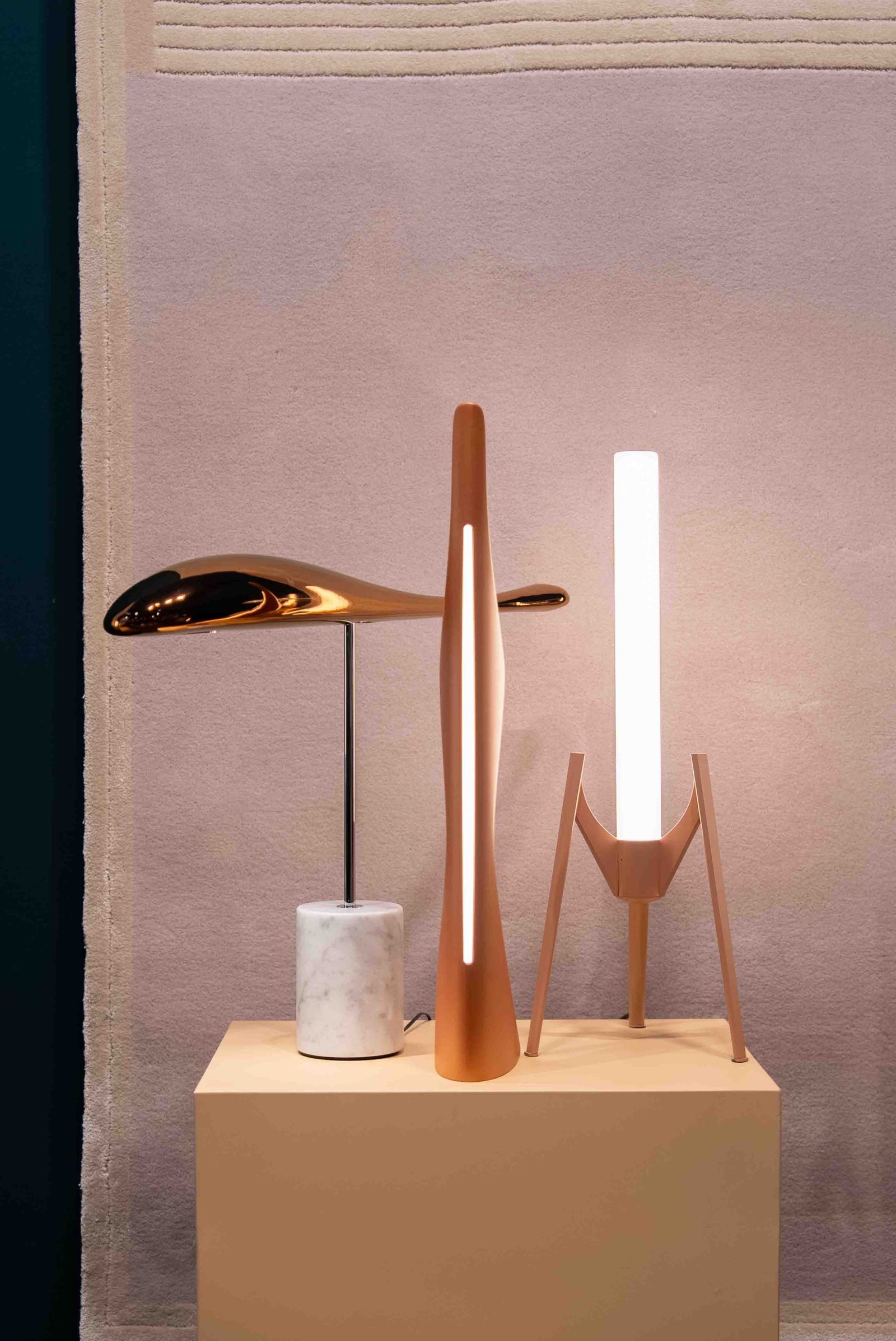 The white and copper colors are available with a white Carrara marble base in a matte finish.