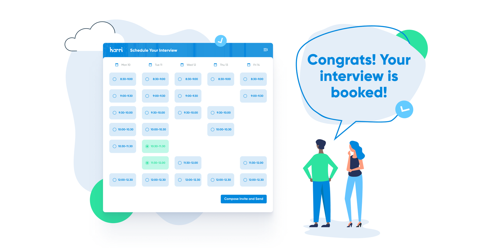 Our speedy screening functionality allows you to accept or reject candidates in a matter of seconds. The interview scheduling process is simplified by allowing candidates to choose availability digitally on a self-select form.