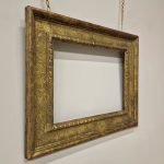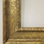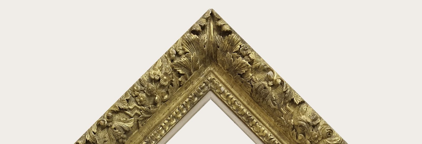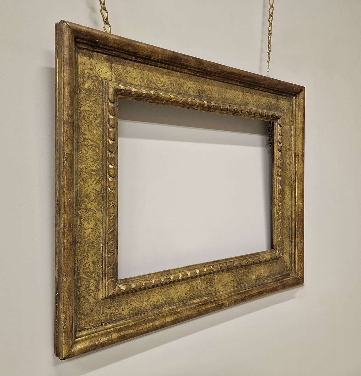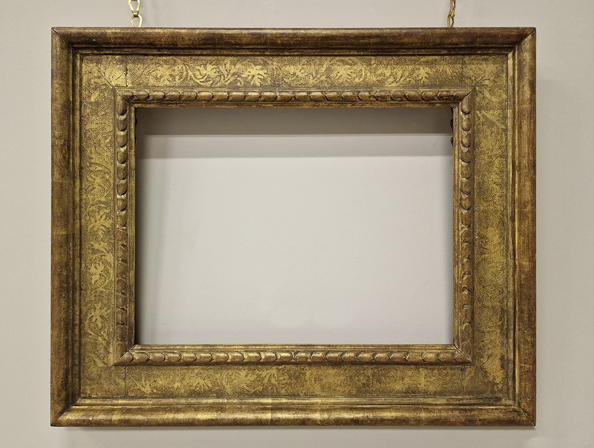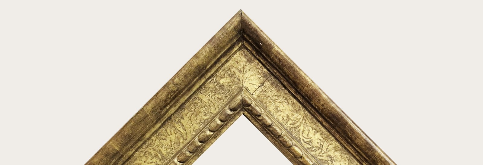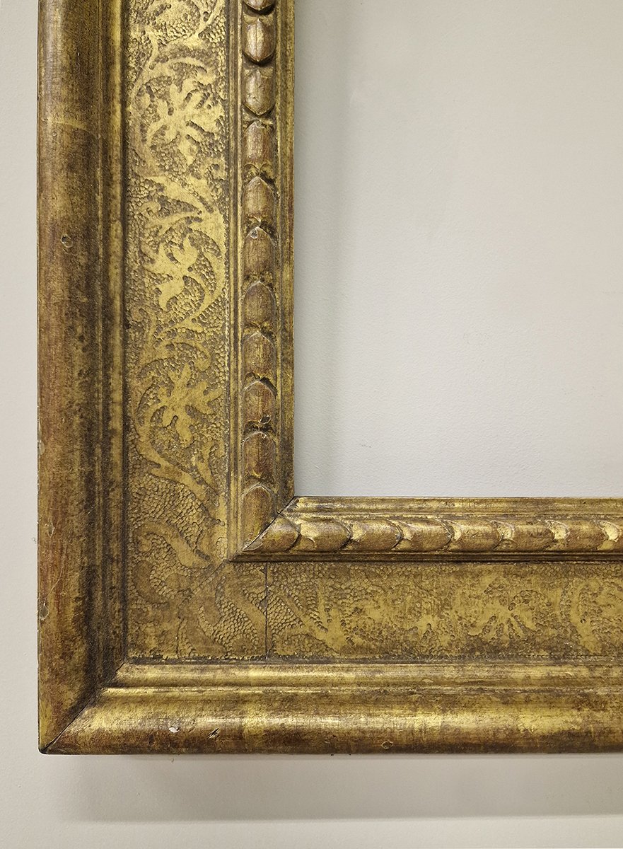 The sight edge of this cassetta has a simple yet stylish carved pattern, whilst the flat has an intricately punched pattern to give it life and texture. The frame is hand made in lime wood with a pine base, gessoed and gilded with 23.75 carat gold leaf. It can be toned and distressed to your preference. The frame can be made to any dimensions required, subject to a minimum profile width of 5cm. The example shown measures 47.6 x 38.1 x 11.5cm.