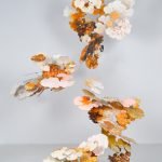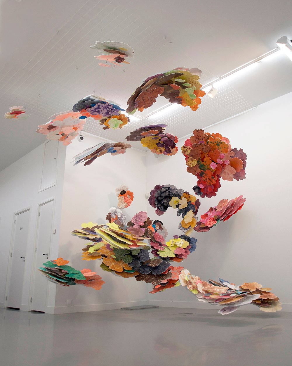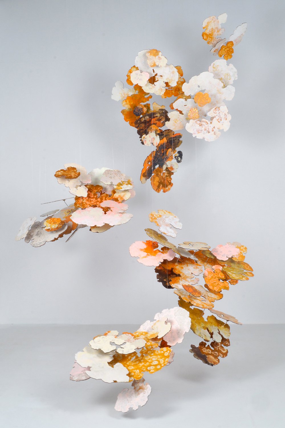 The installations are painted with rich textures referring to micro and macro nature; they are reminiscent of groups of plants in a garden when viewed from above or could be interpreted as microscopic views of nature.