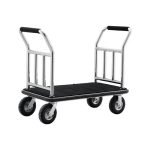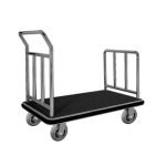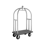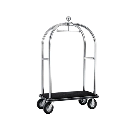 These carts have a sturdy metal frame made of stainless steel, providing durability and an upscale appearance, adding a touch of sophistication. The platform, where luggage is placed, is designed with a carpeted surface to protect guests' belongings, preventing scratches and maintaining a luxurious feel. They are equipped with convenient handles for easy maneuvering and comfortable use. The wheels are large and swivel smoothly, allowing for easy navigation through corridors and elevators.