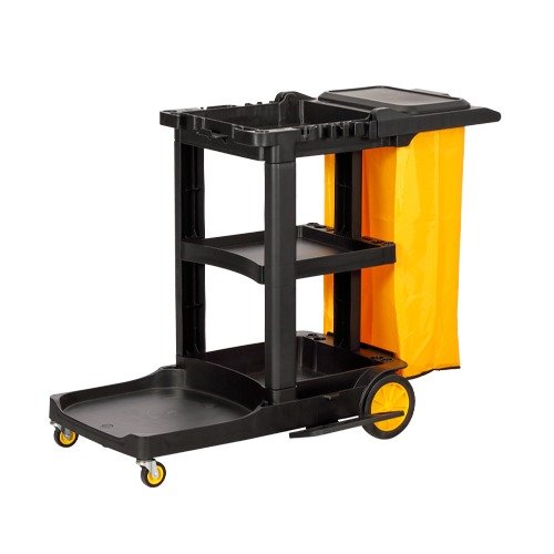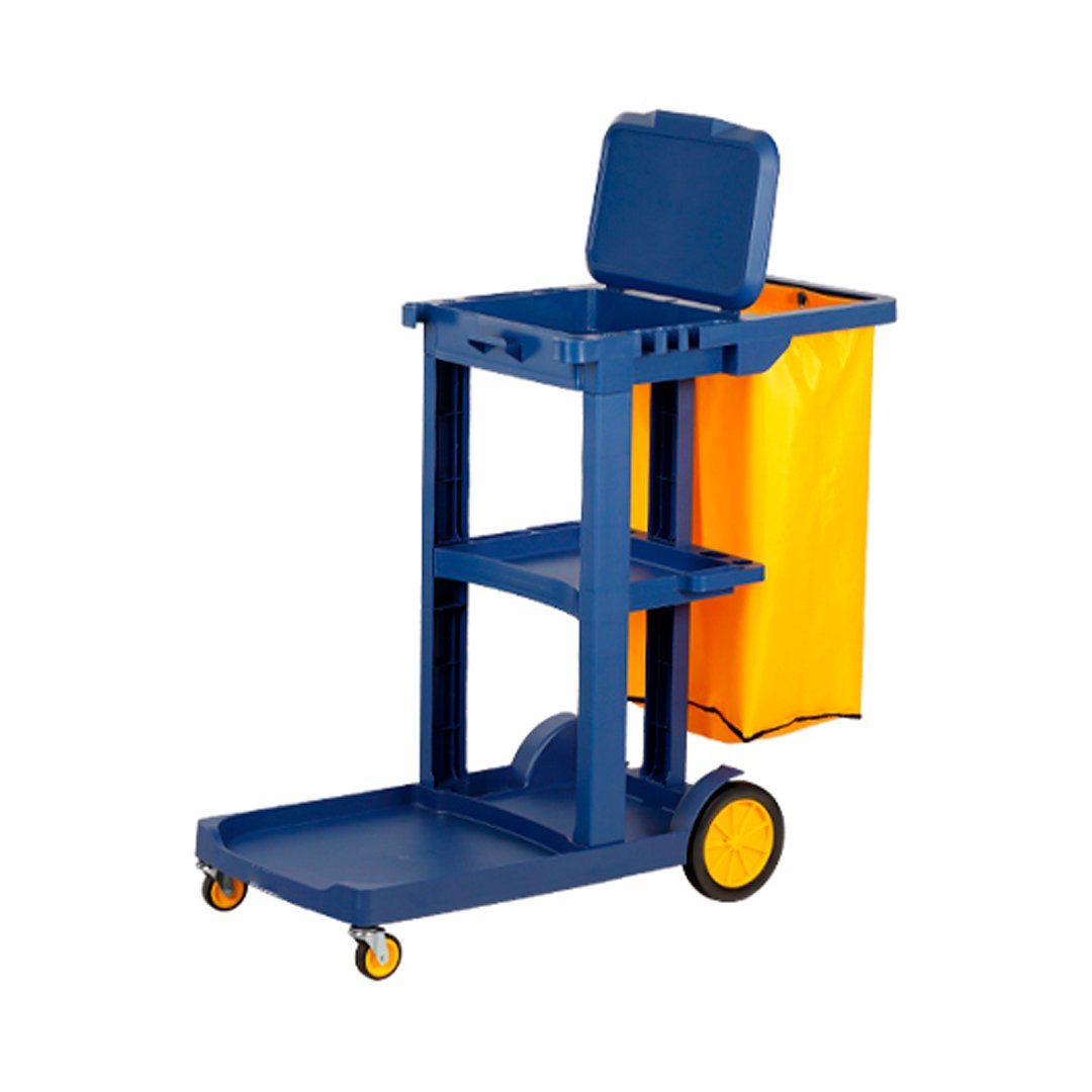The janitorial cart is a mobile cleaning station equipped with various tools and supplies to facilitate efficient cleaning in hotels and other commercial and institutional settings.