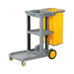 It features a durable mobile platform, constructed with sturdy materials, ensuring durability for frequent use. It includes compartments and shelves for holding cleaning agents, paper towels, trash bags, and other supplies. It provides enough space to carry a mop wringler bucket.