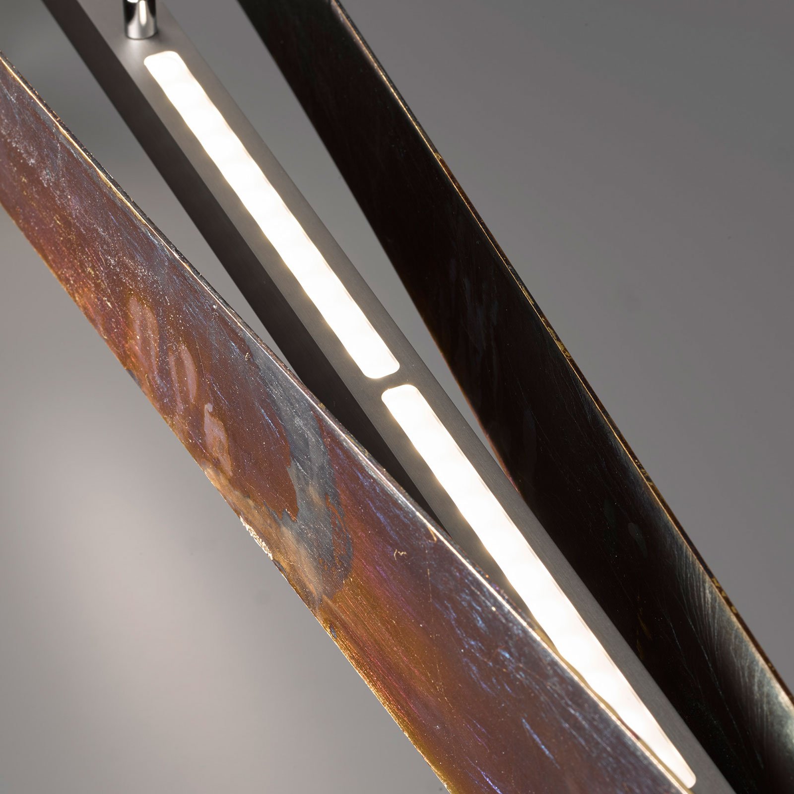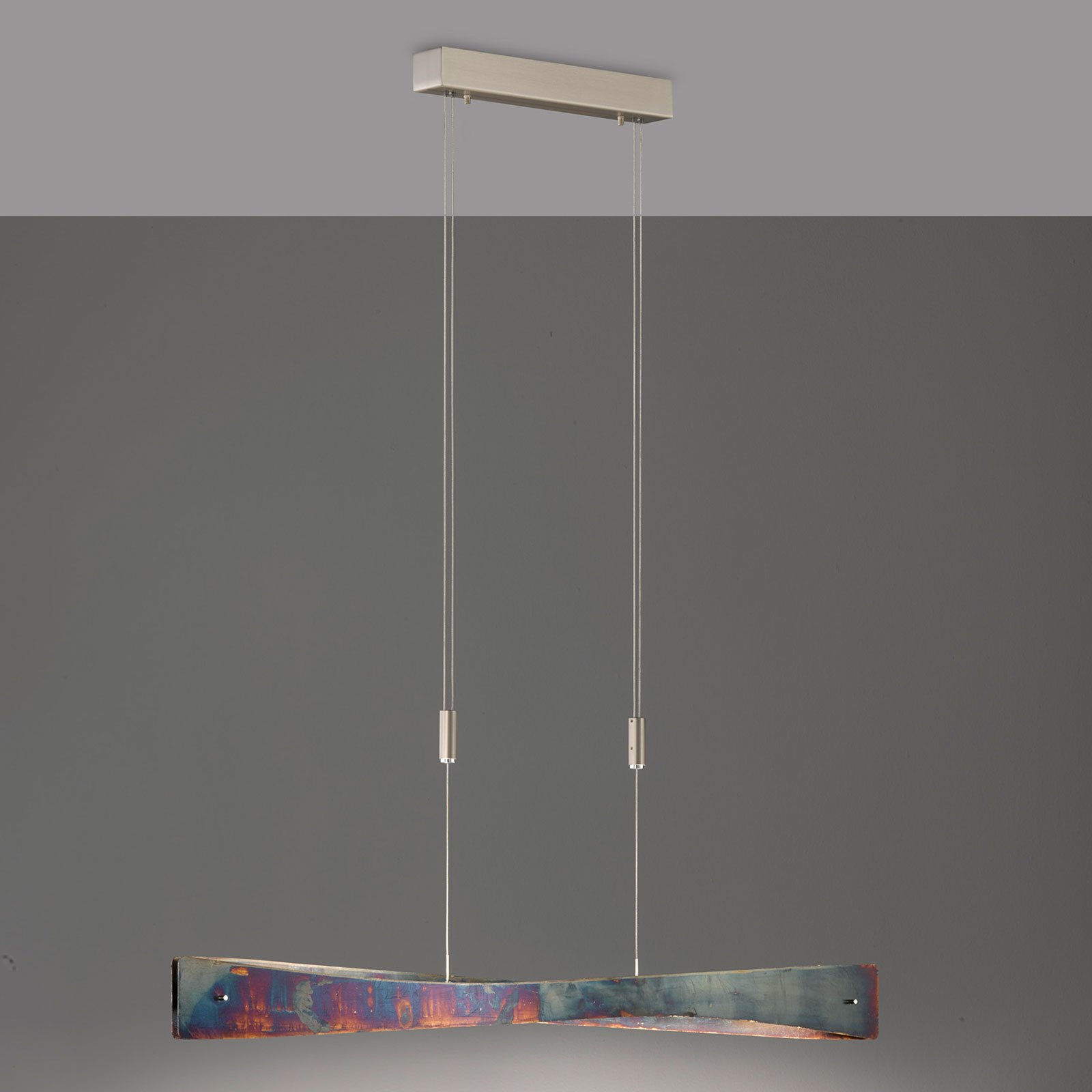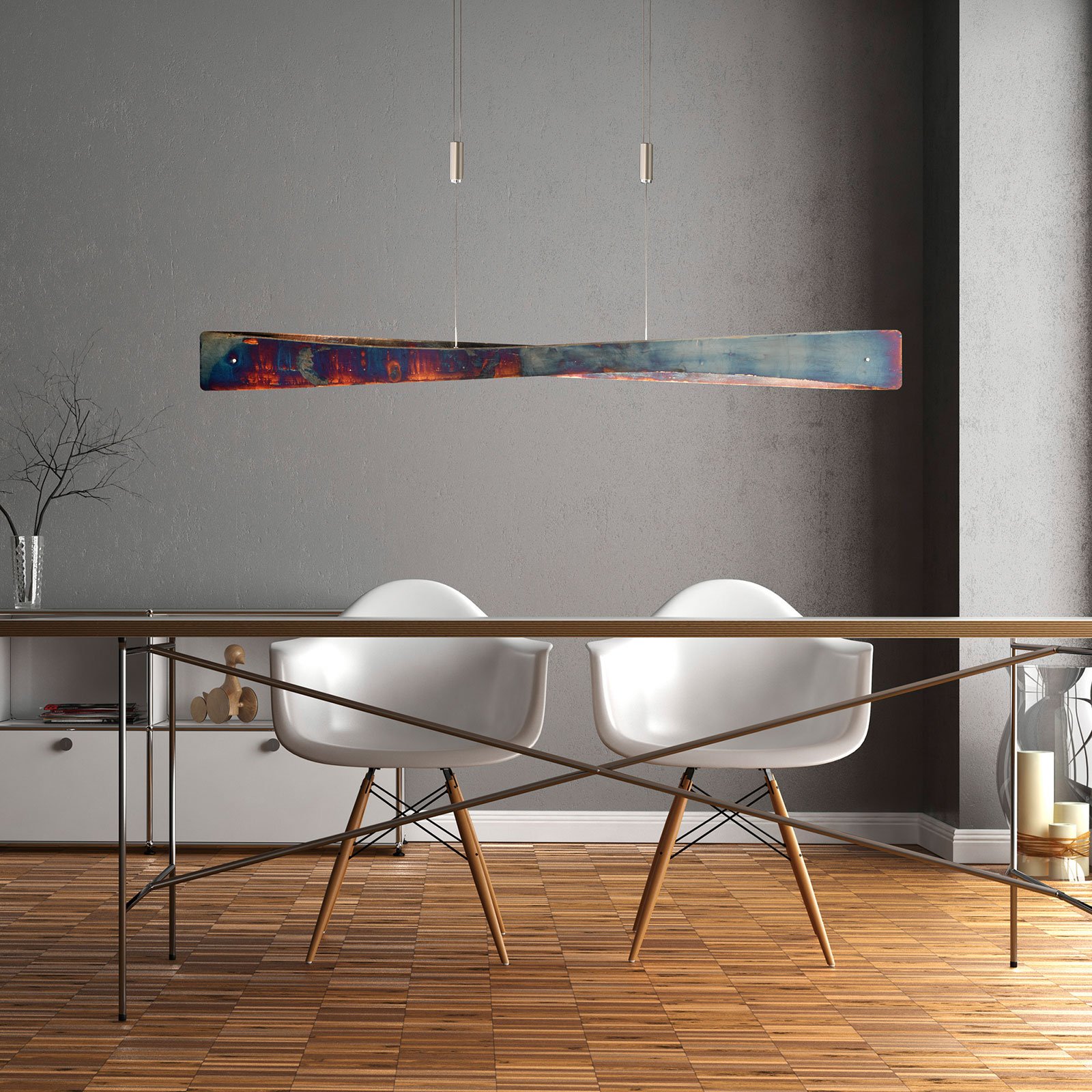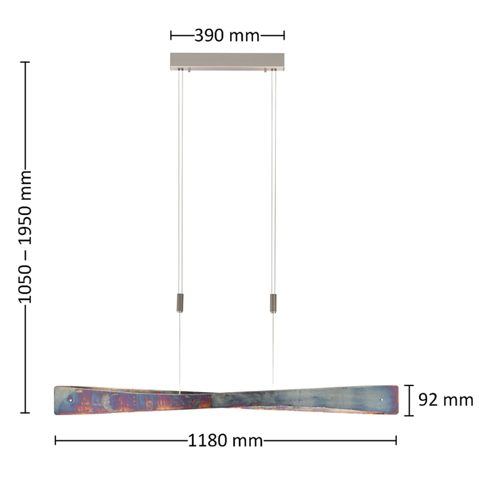Lian is an exclusive light source for dining areas. Its appealing finish is created by the elaborately handmade oxidation of the surface, giving it a clearly vintage character, which is similar to rust. The two aluminium panels are beautifully curved and placed opposite each other, so that the light in the LED linear hanging light emits upwards and downwards and creates a pleasant ambient light. If an external leading edge dimmer or trailing edge dimmer has been installed, you can change the brightness of the warm white LEDs at will.