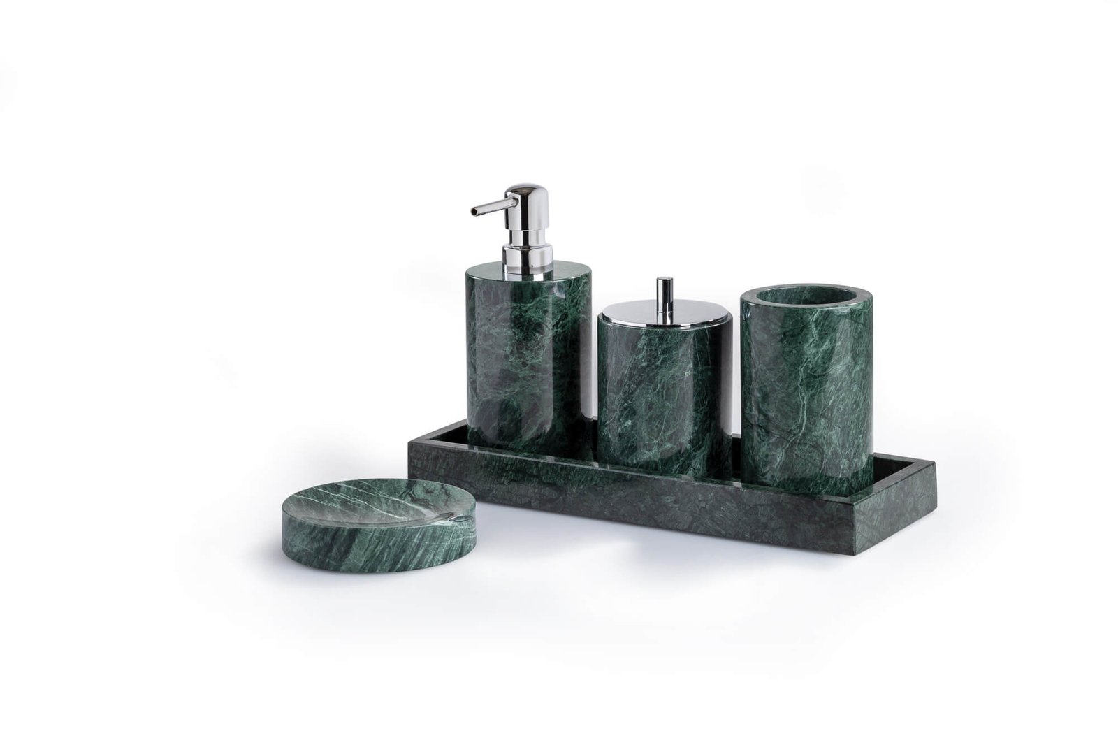 Designed to elevate both aesthetics and function, the set includes a rectangular tray, soap dispenser, soap dish, toothbrush holder, and cotton swab can. Each piece is expertly cut and polished, showcasing the deep green tones and unique veining that make Green Guatemala marble so distinctive.