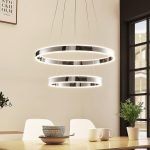 Lyani is ideal for use in dining areas. The LED pendant lamp consists of two large metal rings in different sizes and installed at different heights. Together they produce bright lighting to light up a table. If desired, the brightness level can be adjusted to three different settings to create cosier lighting. You can simply dim the pendant light using the wall switch.