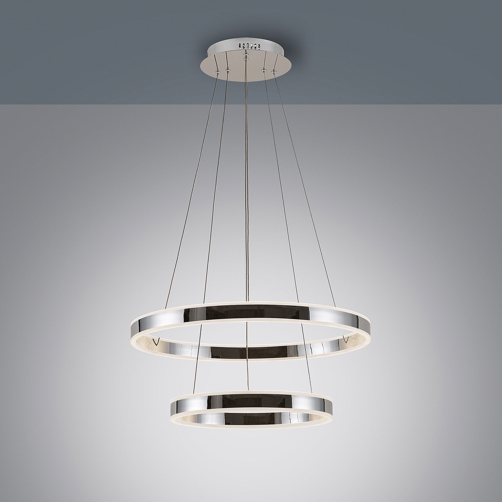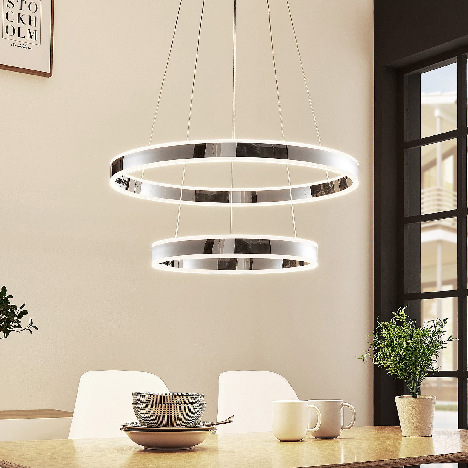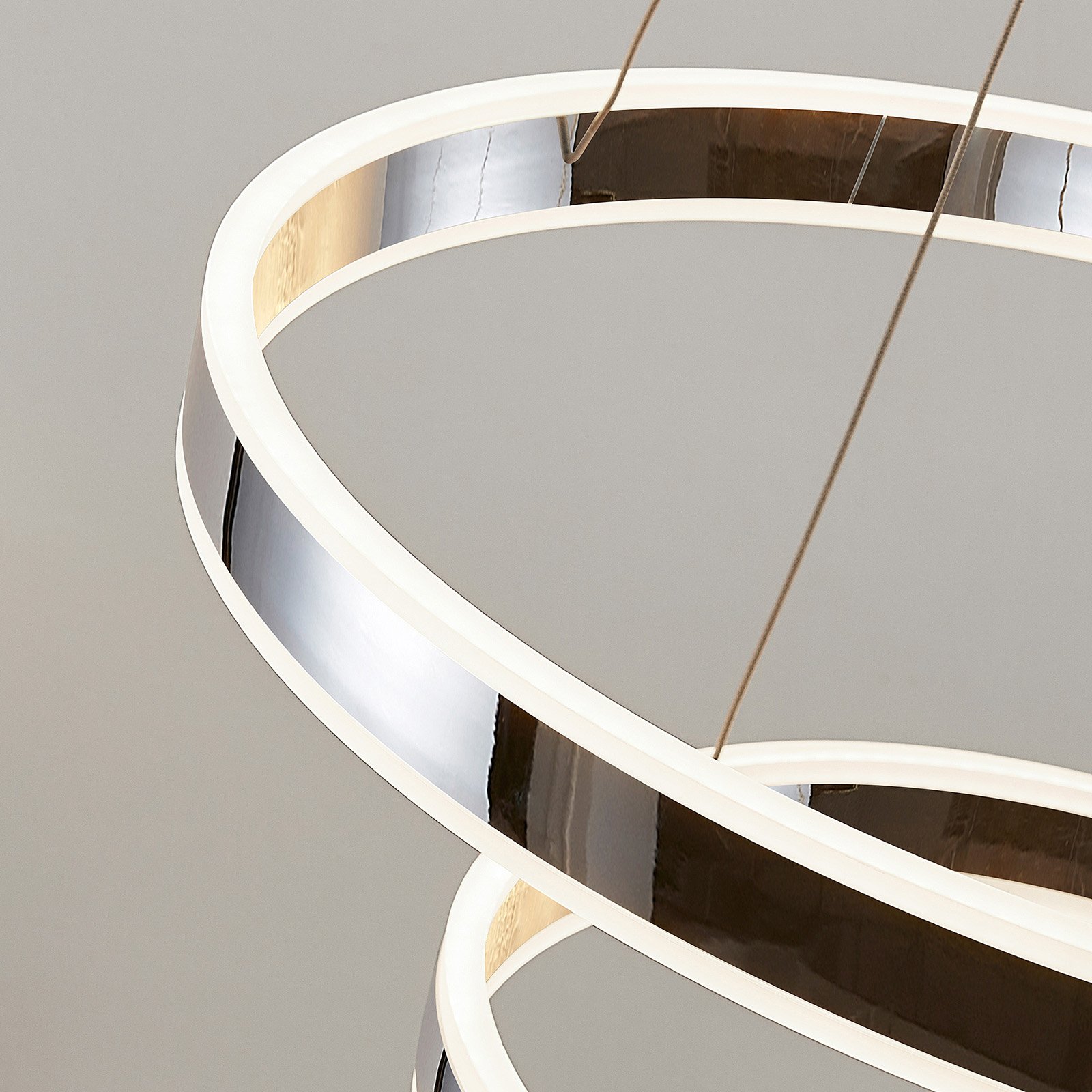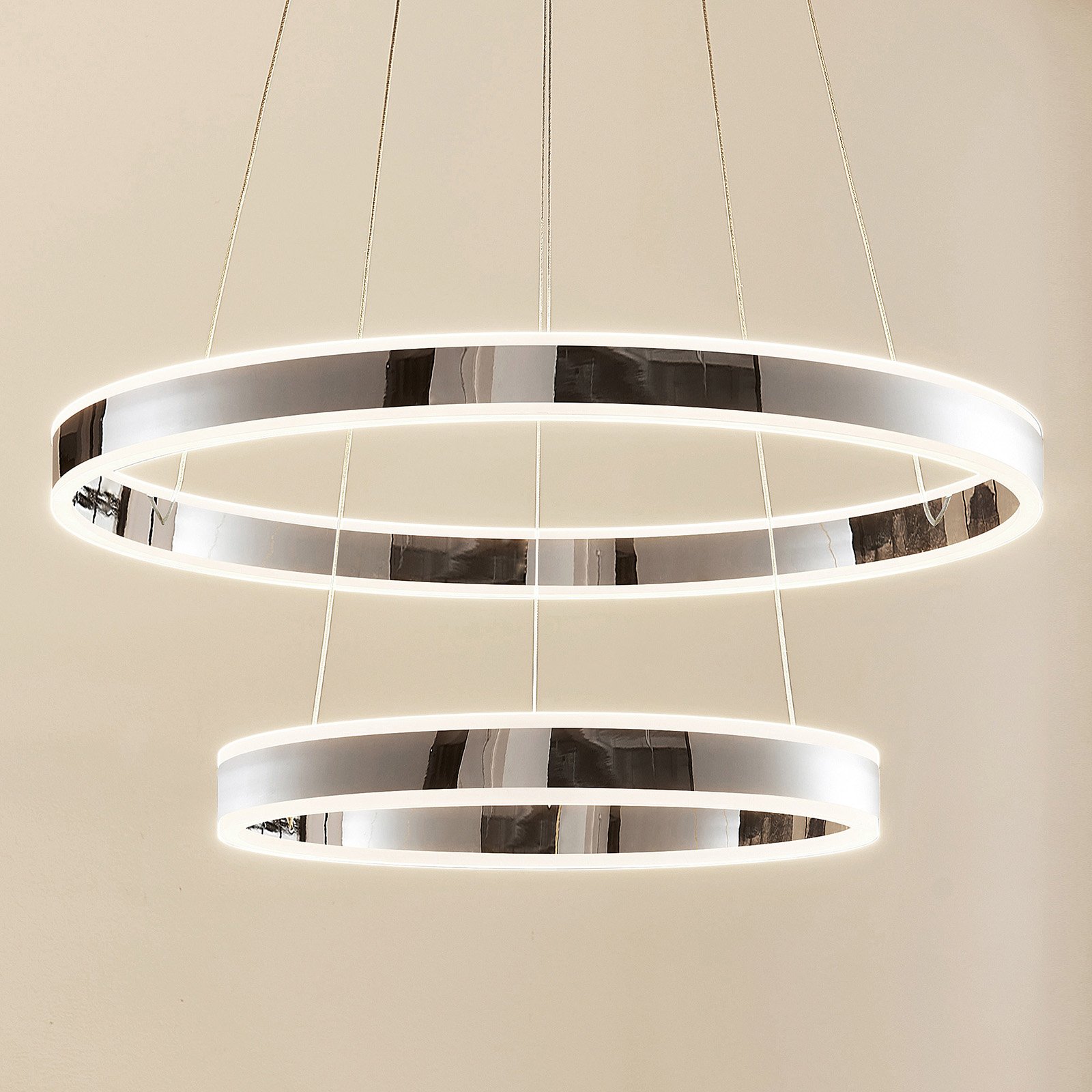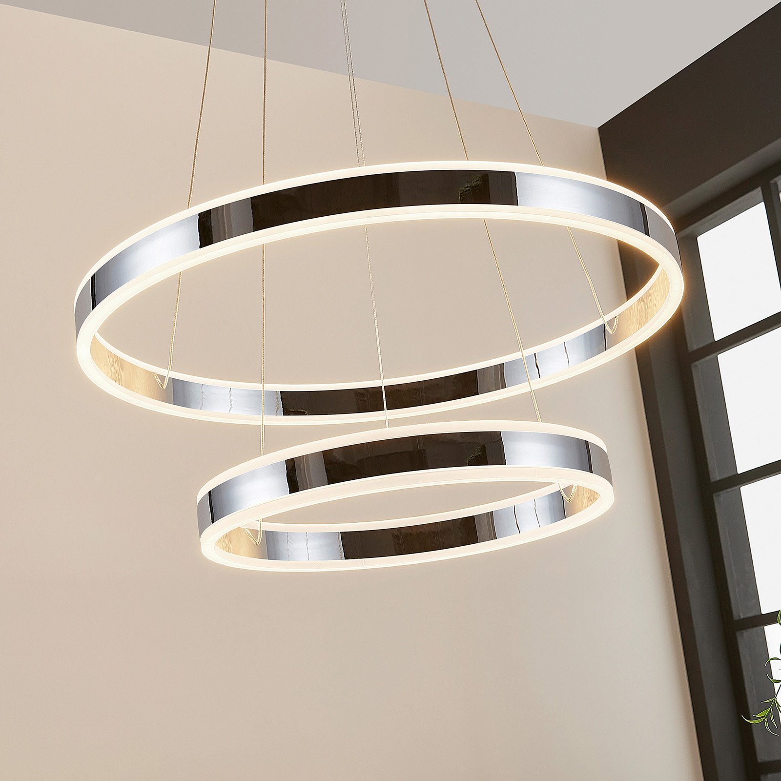 Two-level LED pendant light Lyani with chrome-plated rings in various sizes, dimmable via the light switch