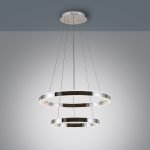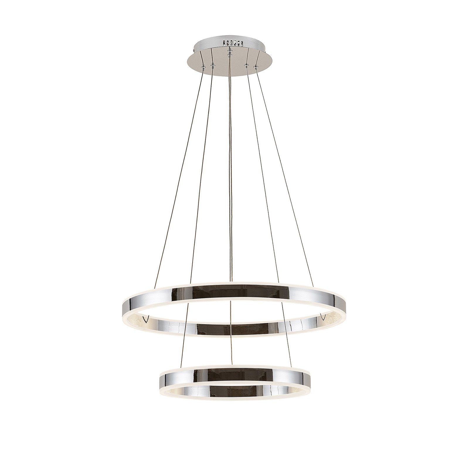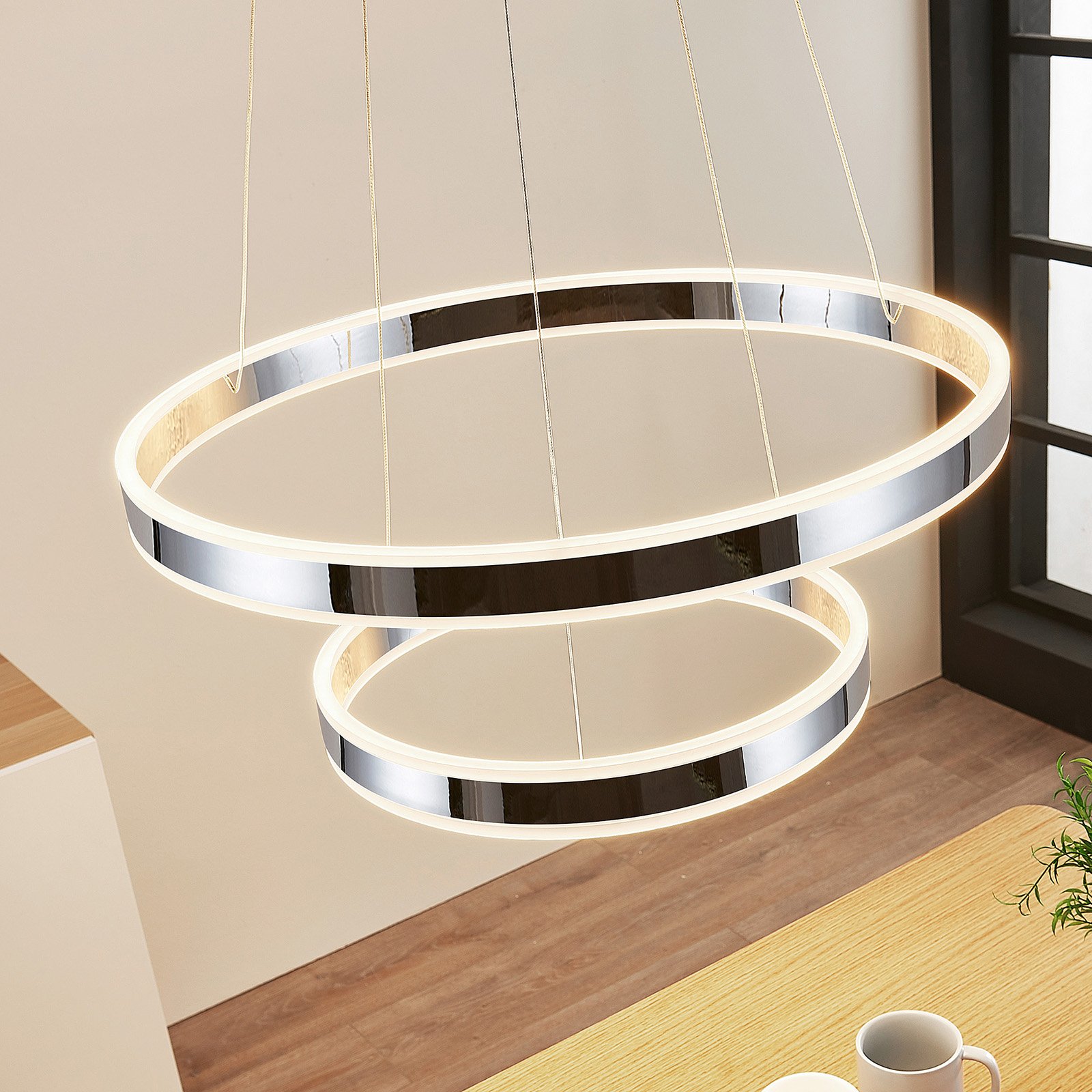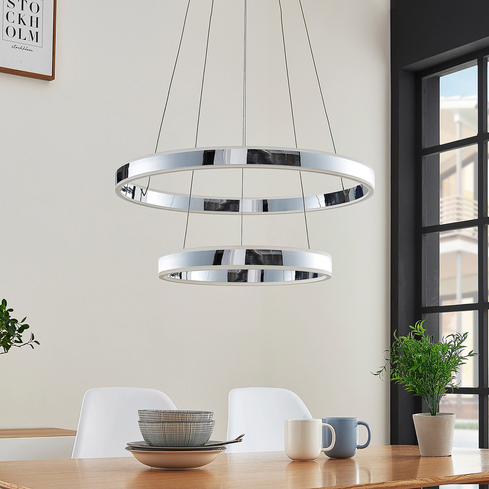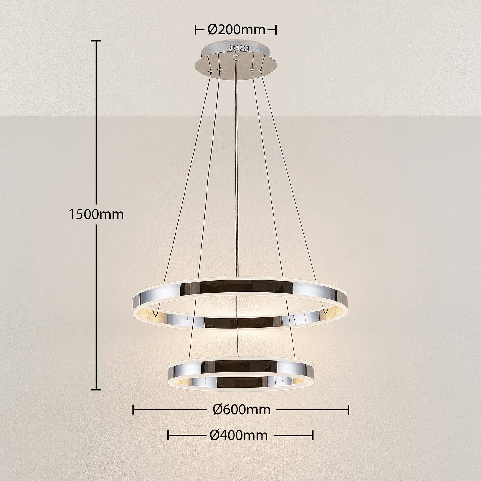 Two-level LED pendant light Lyani with chrome-plated rings in various sizes, dimmable via the light switch