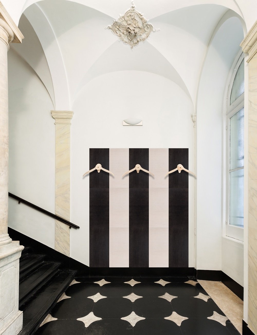 The decorative wooden panels of the Palladio line are available in three variants. Palladio Wengé, with its black colour, is extremely refined; the Grey model has a more modern style, while the White panel, white, gives brightness to the environment When combined with a mirror, the panels can reflect the intricate details of the design and create a beautiful visual effect. The mirror can also serve as a practical element, allowing individuals to check their appearance before leaving the room.