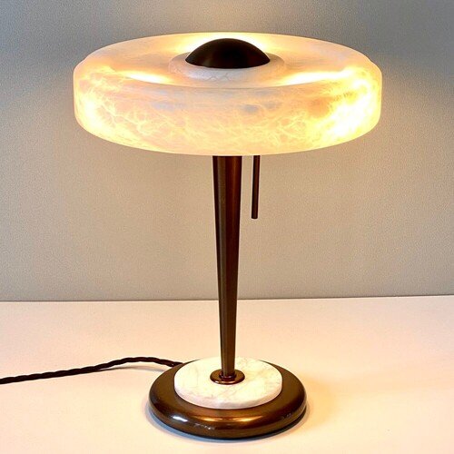 The flat shape of the lampshade adds a touch of elegance and simplicity to the lamp's design. The use of warm colors in combination with the precious materials, such as alabaster and light bronze metal, creates a beautiful contrast that adds to the lamp's retro vibe.