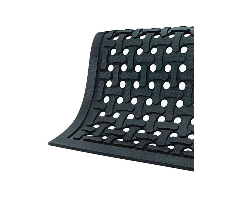 Constructed of 100% high density nitrile rubber for use in wet or dry conditions. Superior in grease and oil resistance than other 'grease proof' mats. Flow-through design allows water and debris to escape away from the feet.