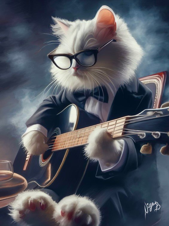 Step into a world of vibrant whimsy with our captivating e-painting portraying a lively cat strumming a guitar amidst a riot of bright colors. Crafted on sustainable pulp AAA paper, each brushstroke embodies our dedication to artistic excellence and environmental responsibility. The cat’s playful expression and dynamic posture exude infectious energy, inviting viewers to join in the musical revelry. Against a backdrop of lively hues, the guitar strings hum with life, creating a symphony of joy and spontaneity. This colorful composition, available in a variety of dimensions, is a testament to the beauty of sustainable artistry, promising to enliven any space with its playful charm.