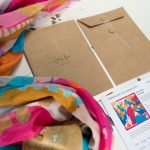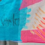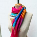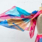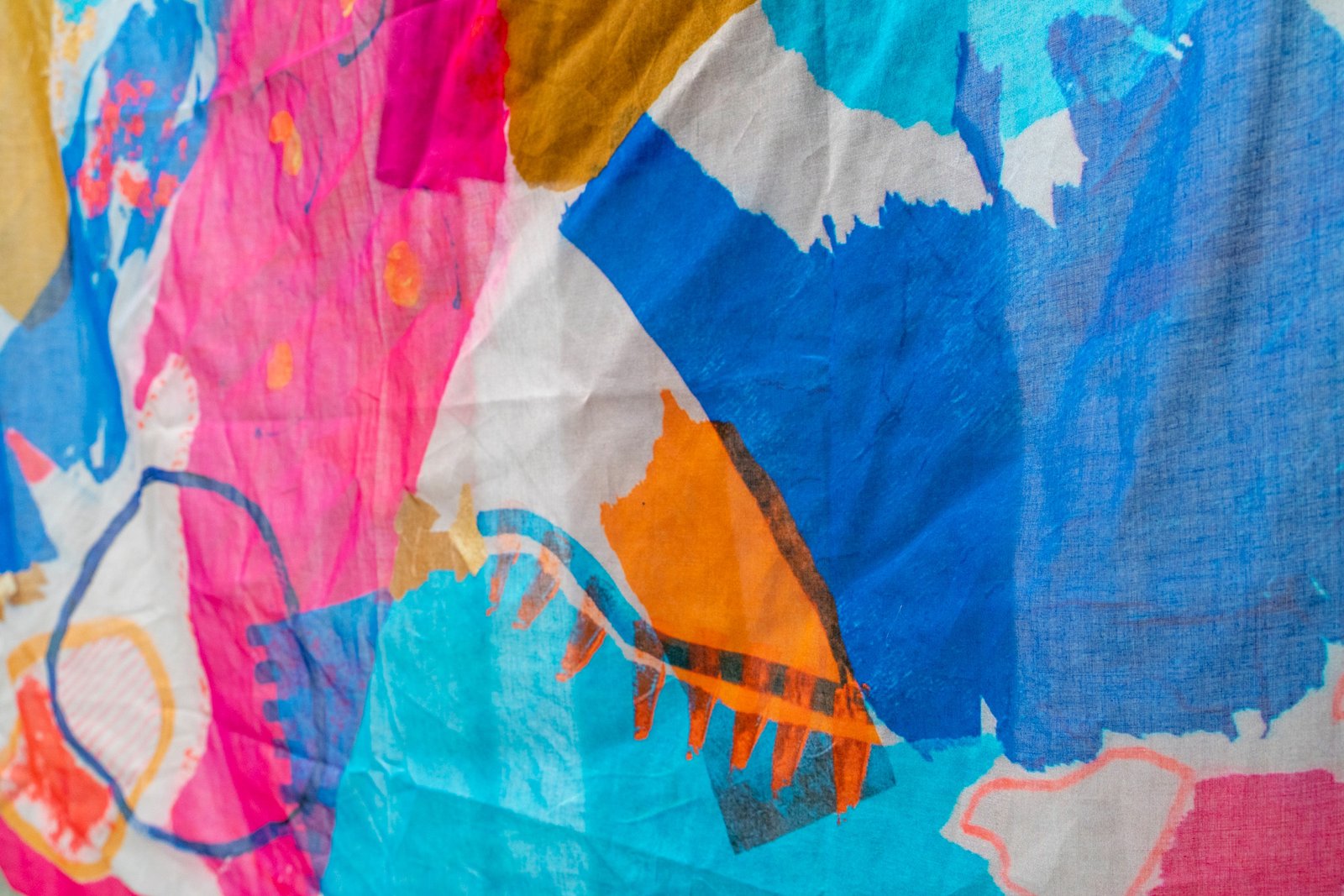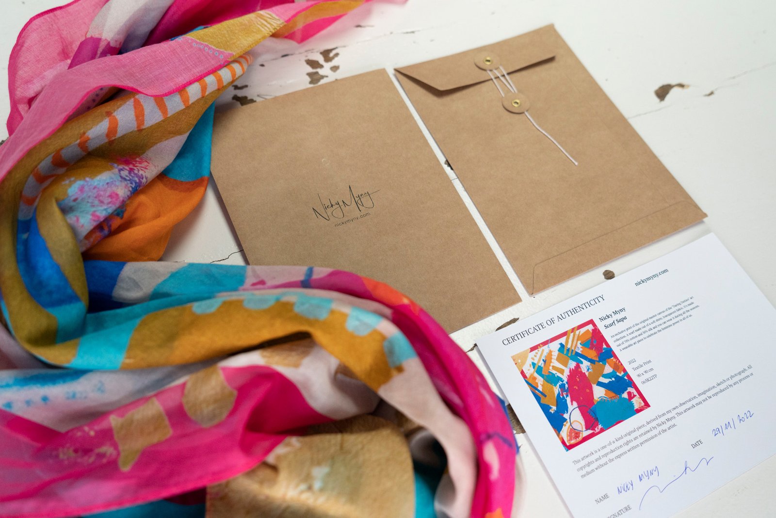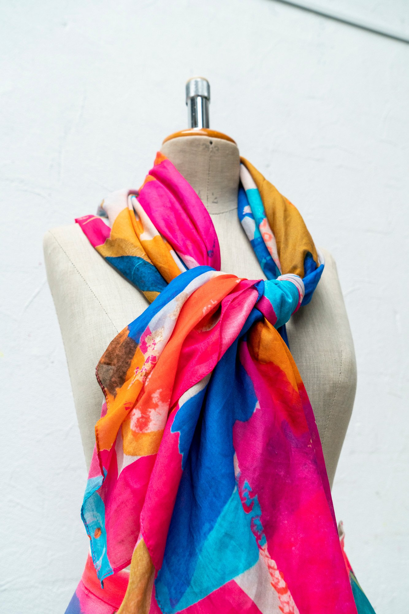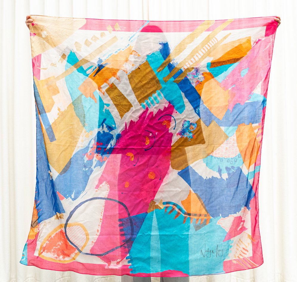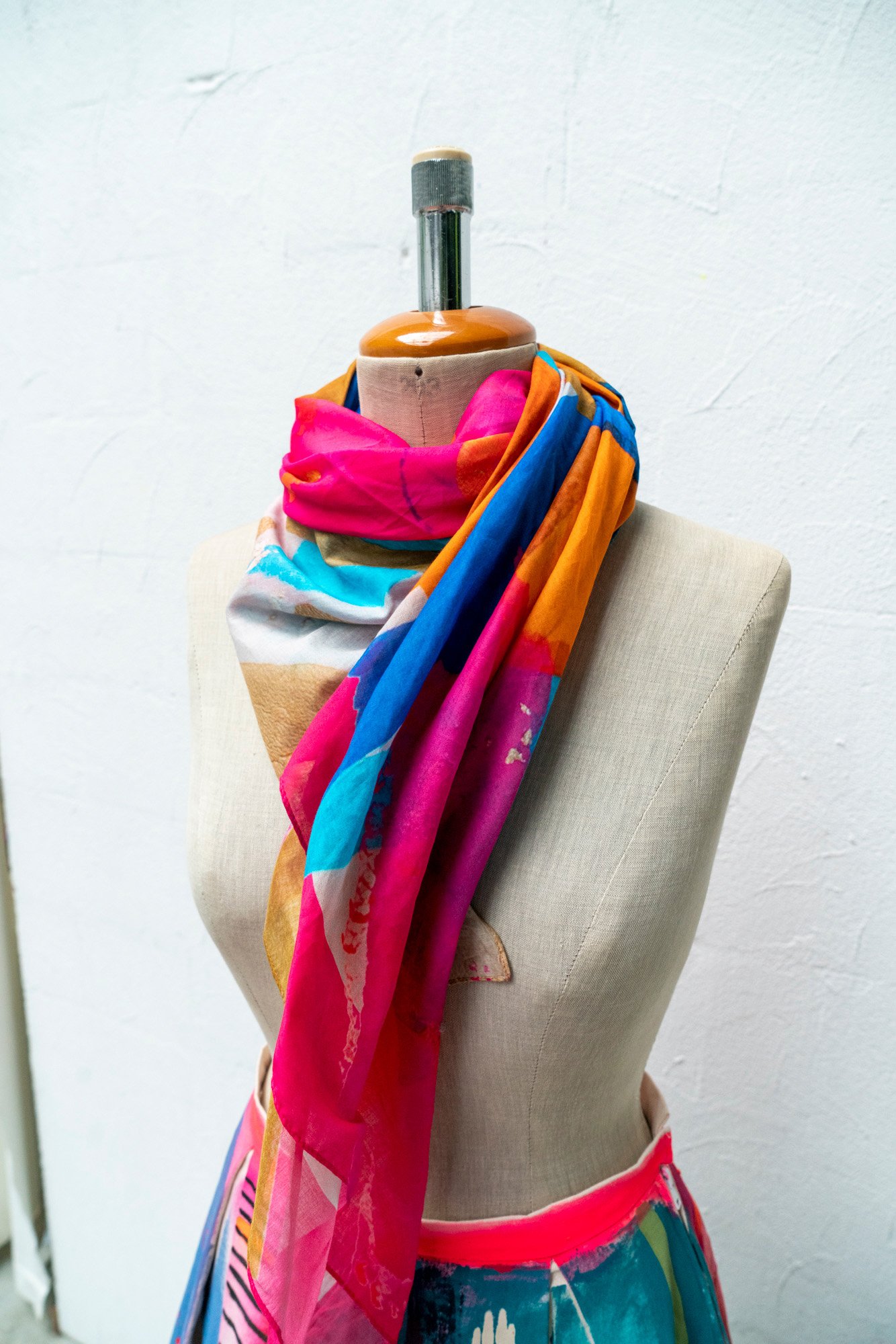 We turn original paintings into limited edition wearable cotton silk scarfs. A scarf made out of a soft shiny, transparent fabric. It's made out of 70% cotton and 30% silk and you can wear it during all the seasons.