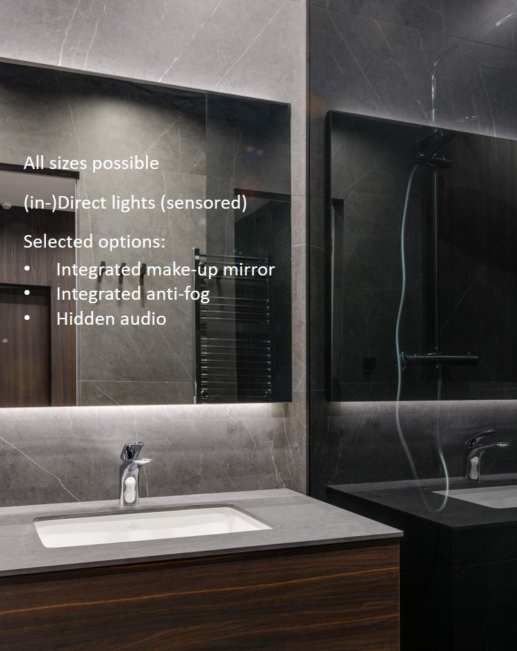 The bathroom mirror is more important than you would initially think. Reviews on Tripadvisor show that quite some guests are complaining about aspects such as the whiteness of the light in the bathroom and the position of the make-up mirror. Turn this around and ensure positive reviews! Integrate lightning in the mirror (direct and / or indirect) and ensure the make-up mirror is in the right position. Prevent fogging of the mirror and add your logo to display on the mirror for that extra touch. Everything is possible, in all sizes.And the price? The Mirrors come directly from the Dutch manufacturer allowing us to pass the savings onto you.
