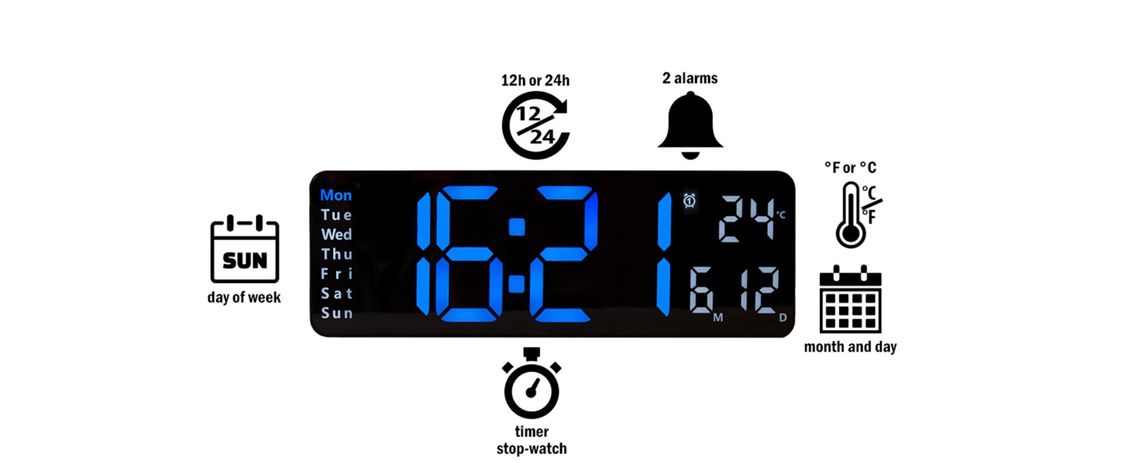 The Opis Clock 1 is an essential addition to any hotel, offering a sleek, 80s style digital wall clock with functionality as impressive as its design. Available in XL and XXL sizes and a choice of color combinations, it's designed to complement any aesthetic while providing useful features for guests.