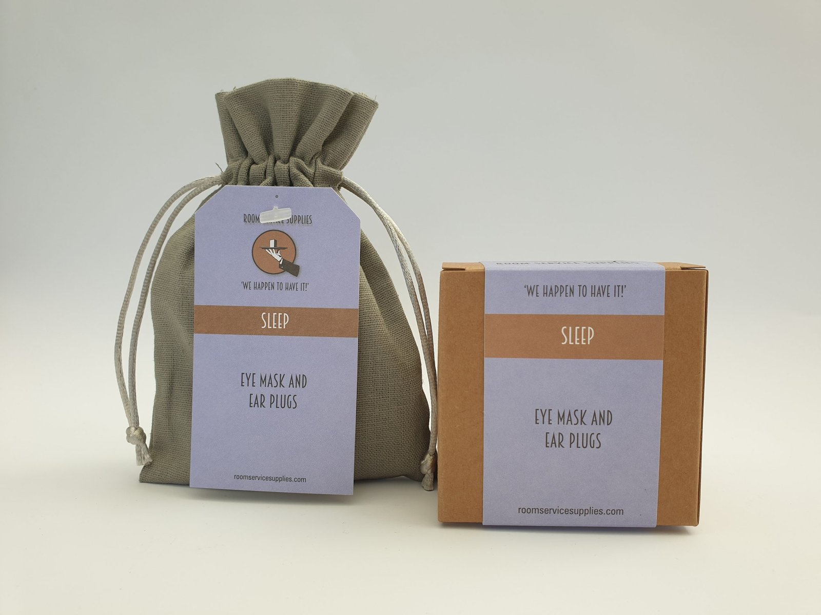 Sleep, is our popular simple guest pack. We have chosen a suite of black gift items, but this along with many of our other products is completely flexible. In this instance, fabric type and colour, our standard is a soft bamboo cotton. We can have it printed or embroidered for you. Even the earplugs can be colour co-ordinated and supplied in a variety of travel containers.