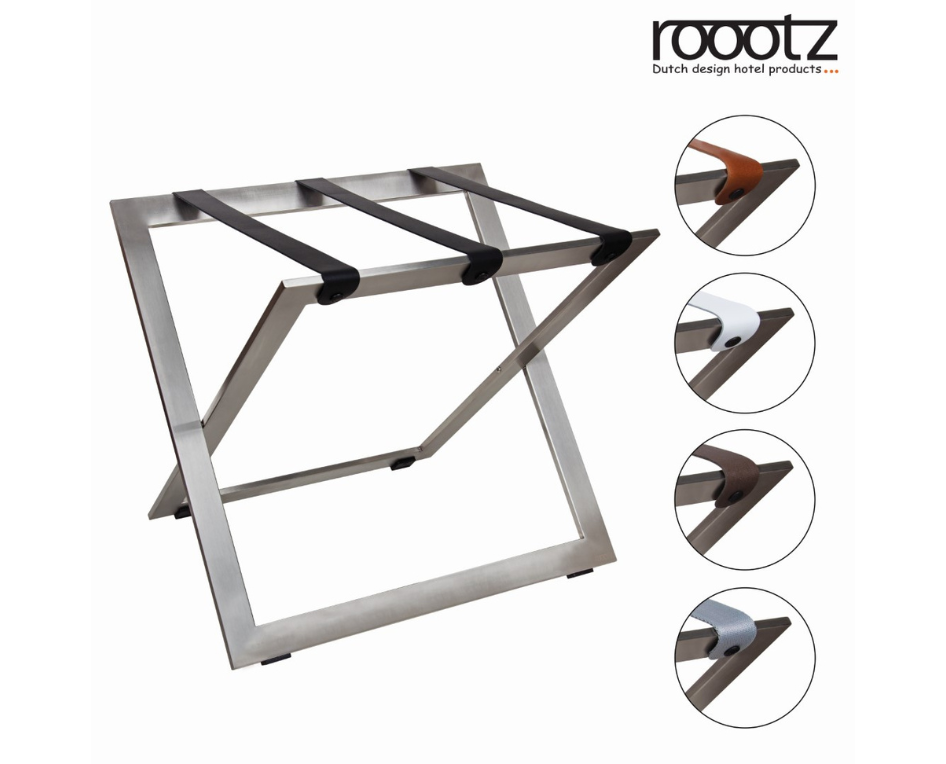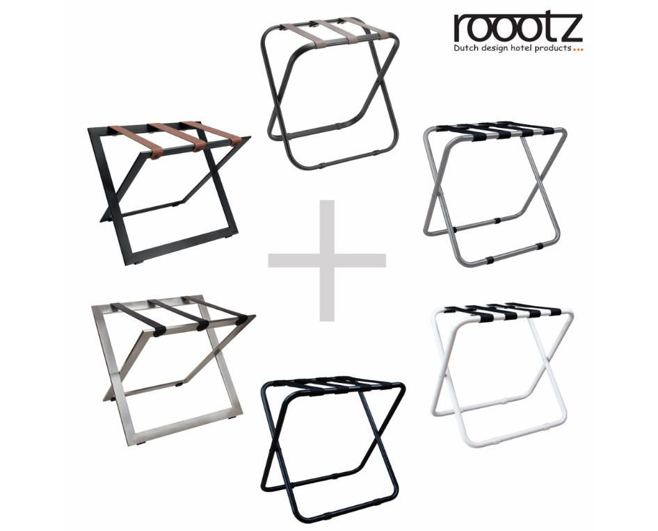 Luggage Racks made of steel in various colours and shapes. Available with straps in leather and nylon. Roootz focus is to design, manufacture and sell high quality luggage racks for hotels. All Roootz Hotel Luggage Racks are designed with an eye for detail and functionality. The luggage racks can be customised with customer logo’s and can be made in different sizes or colours. This opportunity gives the Roootz hotel luggage racks their unique character to fit in every hotel room.