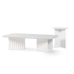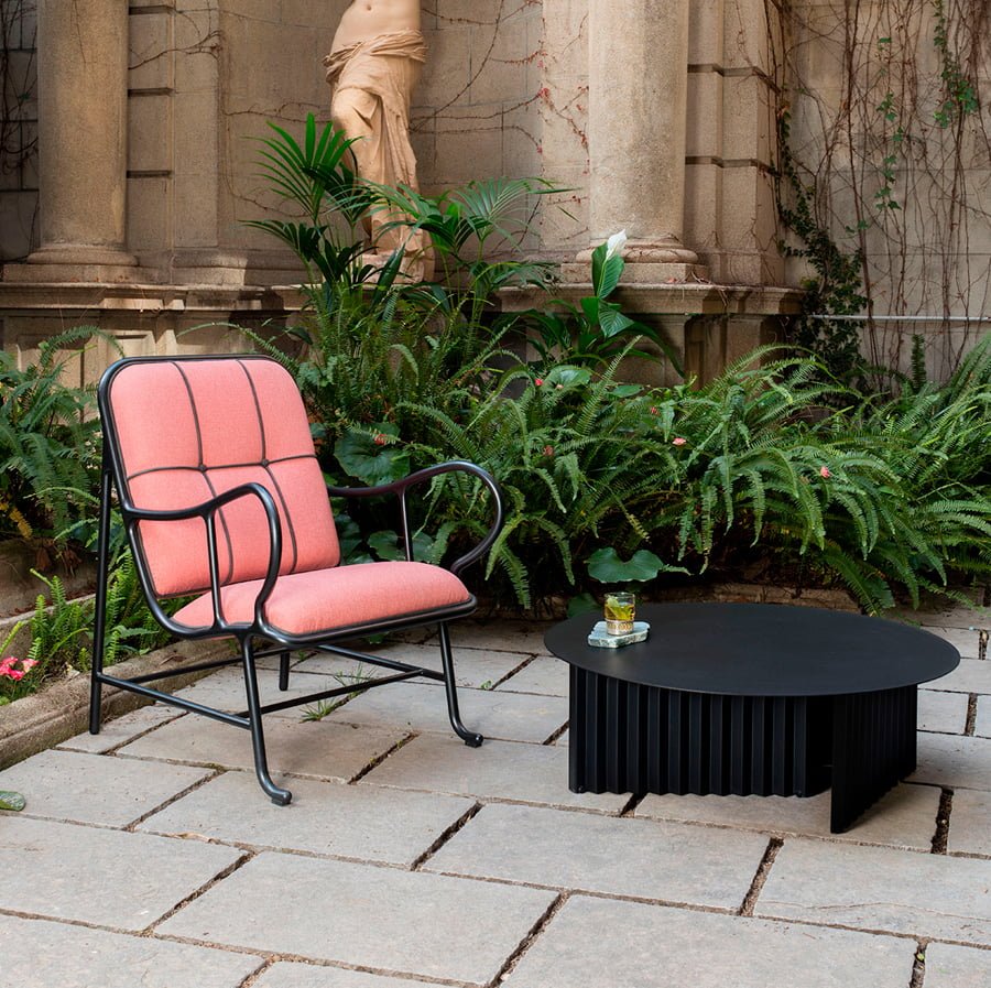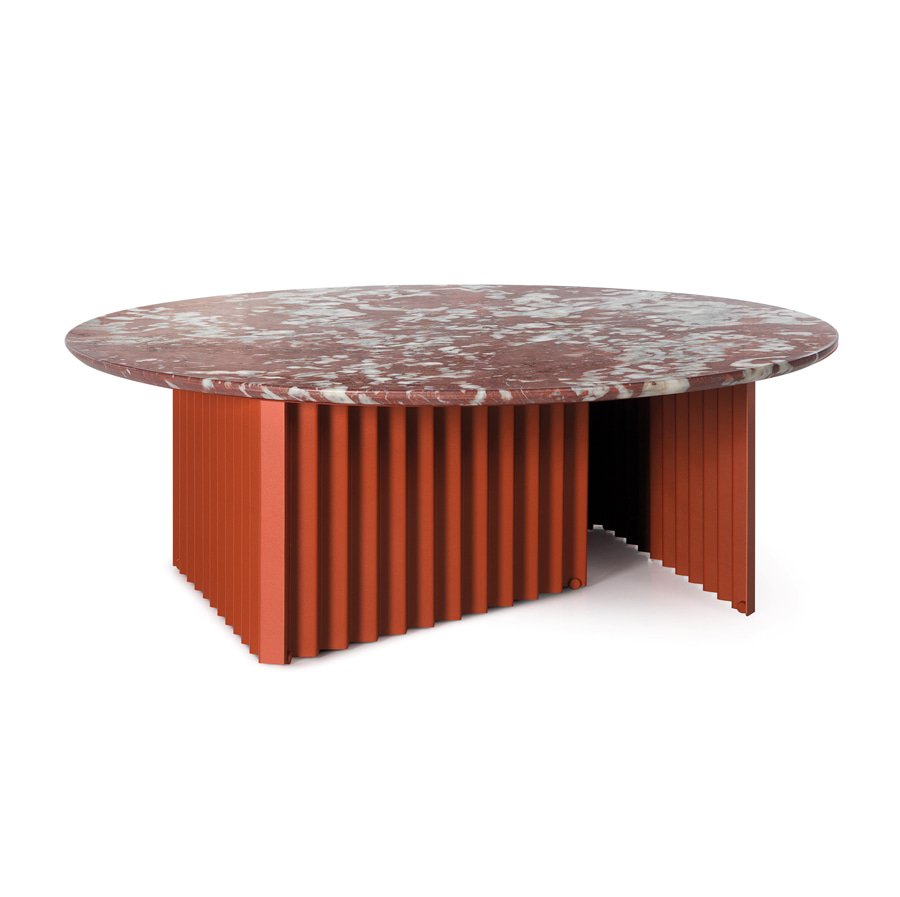 Plec is a collection of tables that are as happy together as they are apart. With their accordion-shaped legs, they love creating light and shade effects with their symmetrical folds and sensual colours. Their sculptural design, which might seem classical at first, proves capable of adapting to every atmosphere. Metal gives them an industrial feel, and marble, the elegance and authenticity. Colours confer personality and uniqueness. And with the combination of these elements, Plec reveals its savoir-faire. Quiet and restrained presence, without raising its voice, but uncovering the beauty of perfection. The Plec collection includes rectangular and round occasional tables, a desk and a pedestal.
