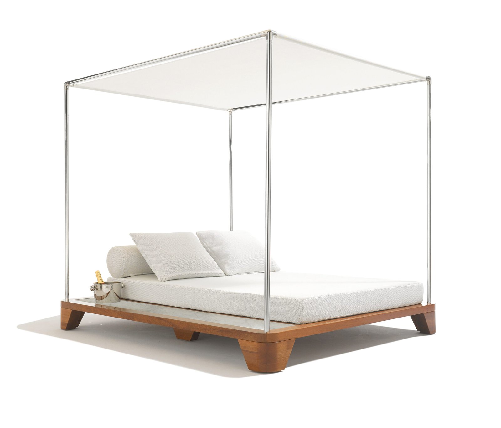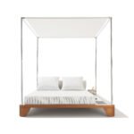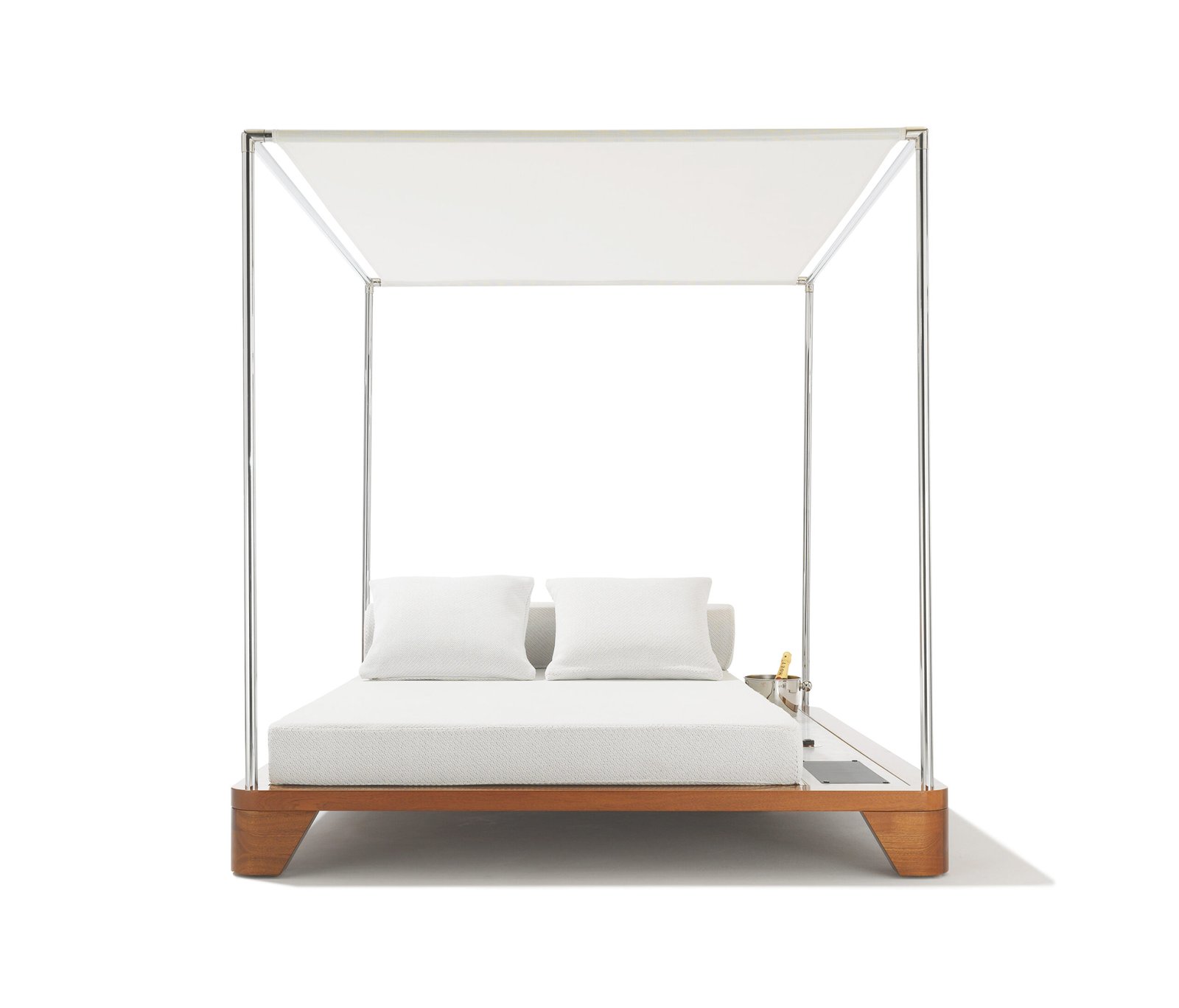 A stainless steel canopy provides shade and seclusion, fitted with high quality Batyline fabric that is both weather and UV resistant for lasting performance. Integrated Smartbrella Technology features a discreet solar powered USB socket, allowing effortless device charging while you relax. Alongside the bed, a fixed marble topped side table adds practicality and elegance, with optional holders for plants or an ice bucket to enhance the experience.