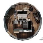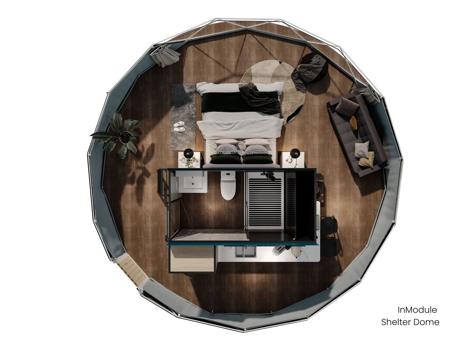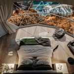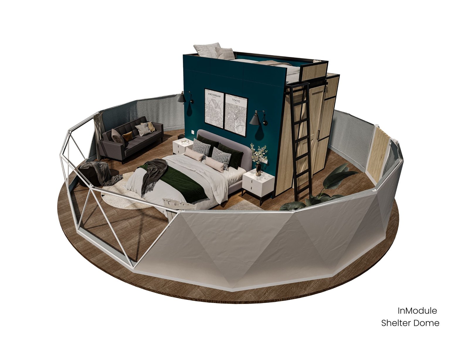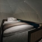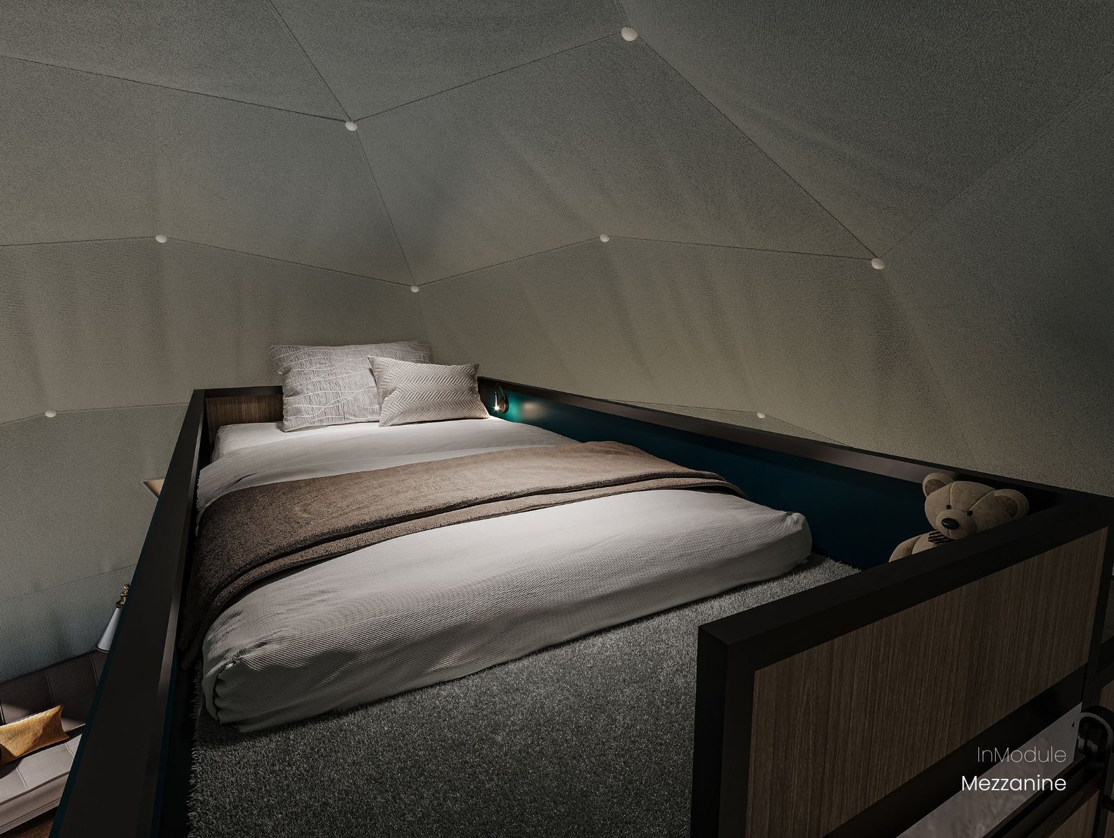 The modular interior designed mezzanine makes full use of the upper part of the dome, providing an additional accommodation area. A full sized bed can be placed in this zone, suitable for an adult or a child to rest and sleep. This area can also be converted into an entertainment section without beds.