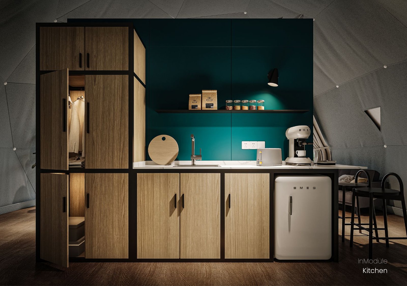 Equipped with a sink, countertops and sufficient cabinets, the kitchen module provides cleaning, storage and food preparation functions. The specially selected cabinet veneer blends the glamping style perfectly into the kitchen area.