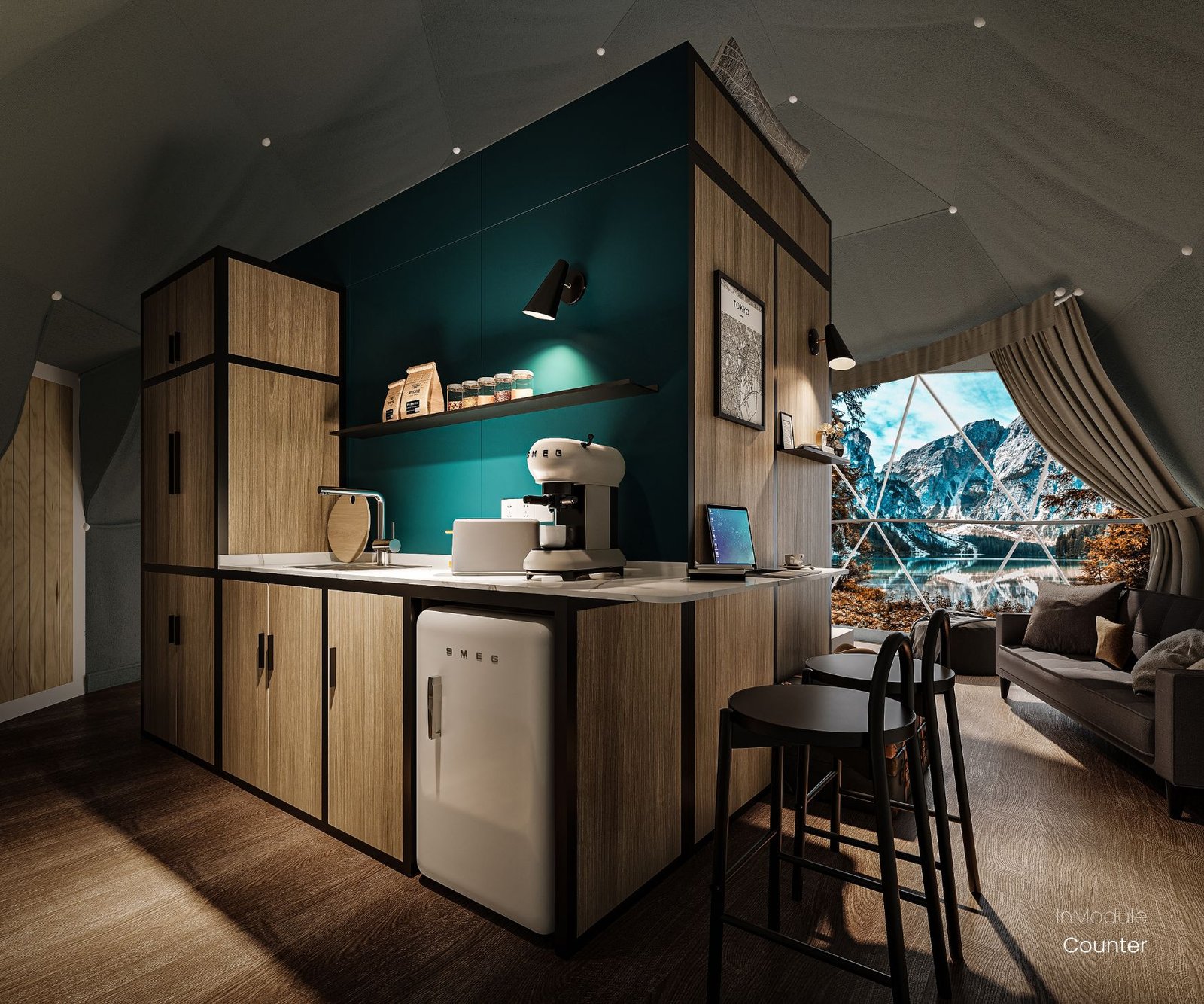 A chic foldable counter is designed for easy storage and can be used as a dining area or office area, catering to the diverse needs of lodgers. Bring the counter as a bar table to glamping life and make it possible to have a productive staycation.