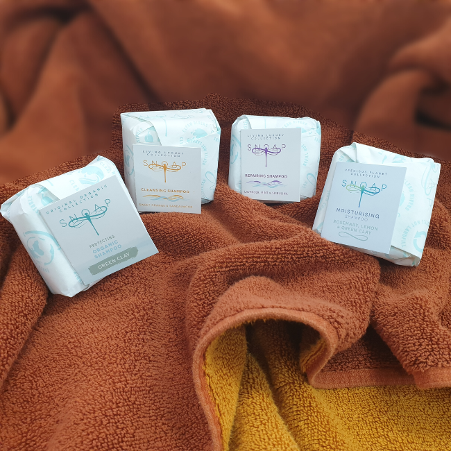 Our collection of 4 luxury hand-made SNOAP shampoo bars leave hair beautifully clean and conditioned.