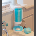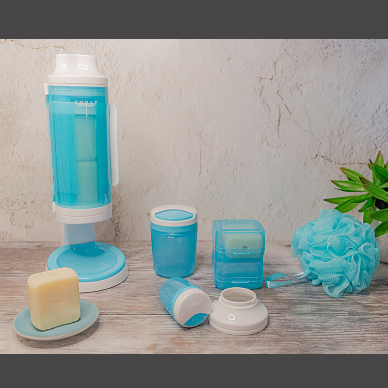 The SNOAP dispenser comes in 2 colour ranges – Theia (White/SNOAP Blue) and Erebus (Grey/SNOAP Blue). Each range includes large & small on the go dispensers, stacking SNOAP boxes and shower puffs each made from 3 bottles of recycled ocean plastic.  Perfect for use in rooms, guest gifts or for sale in your hotel gift shop.