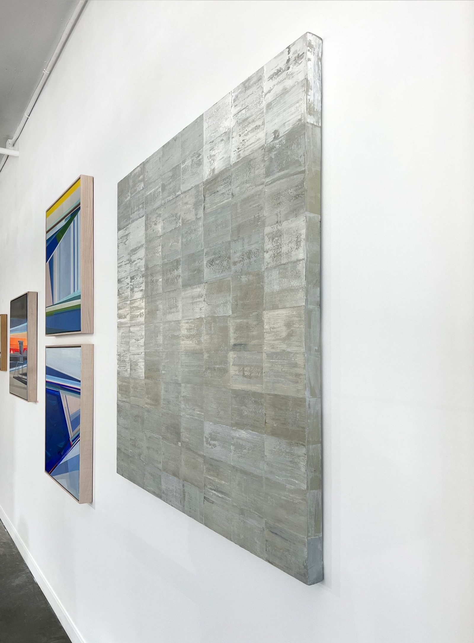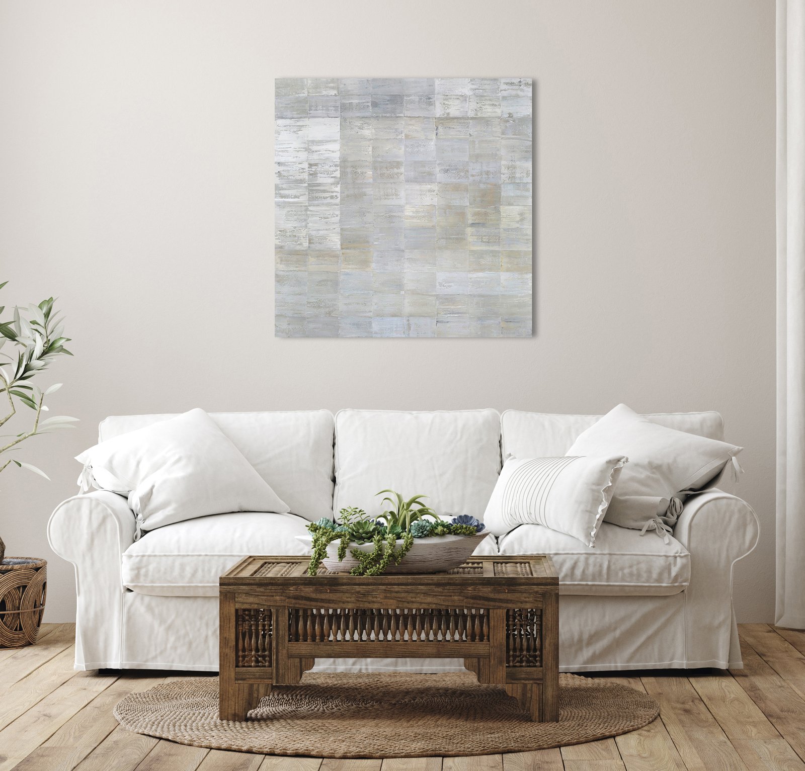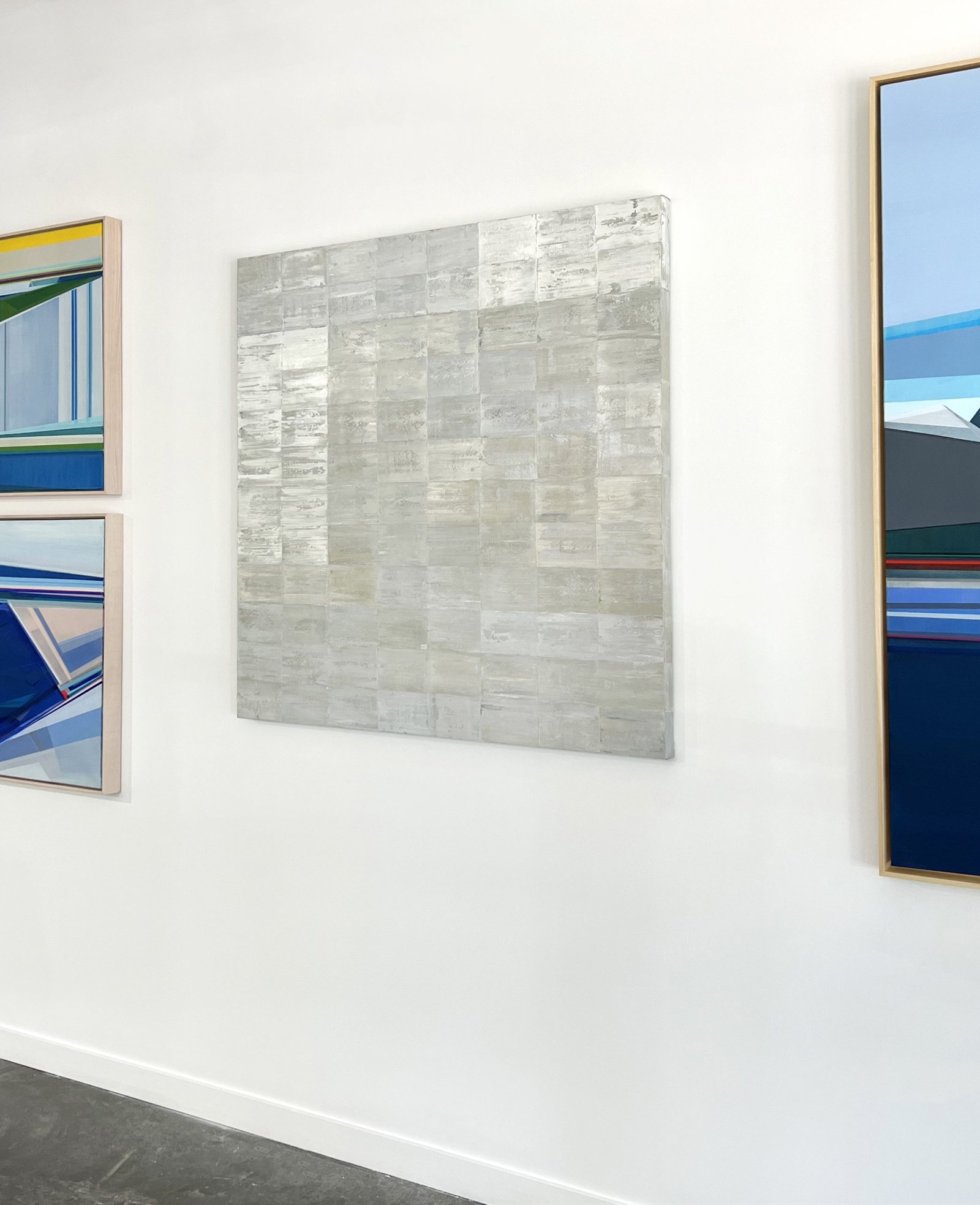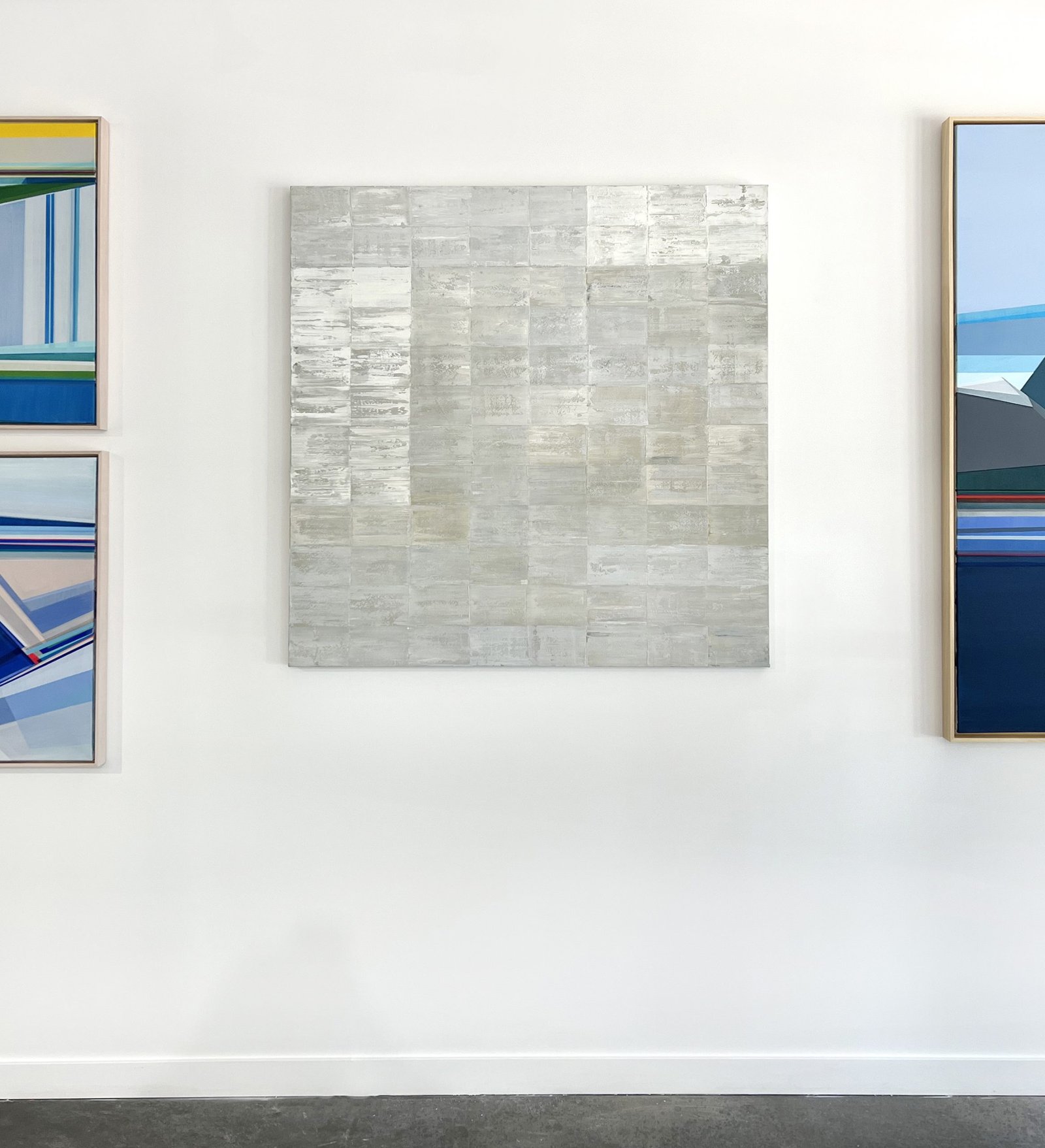 This is an original abstract painting by Ned Martin made with oil paint on canvas over panel. It features a light palette, with soft, rectangular shapes patterned side-by-side. It pairs beautifully with Moon Dance, a painting by the same artist (see images to see the two together). This painting is also available as a print - which can be customized by style (paper or canvas), size, and frame.